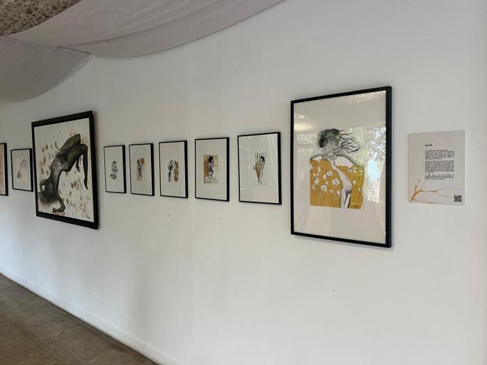 Il y a aussi des bijoux, des sculptures et puis les œuvres sur papier et les toiles de Karib, où l'encre de Chine, l'aquarelle et l'acrylique racontent les recherches de l'artiste.