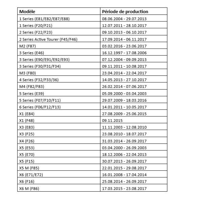 Mais, avec la reprise annoncée de la marque par le groupe Parfait, il se pourrait que les choses avancent avec la relance de la campagne de rappel pour les véhicules concernés. Le groupe BMW indique mettre en place un dispositif exceptionnel pour les véhicules suivant :