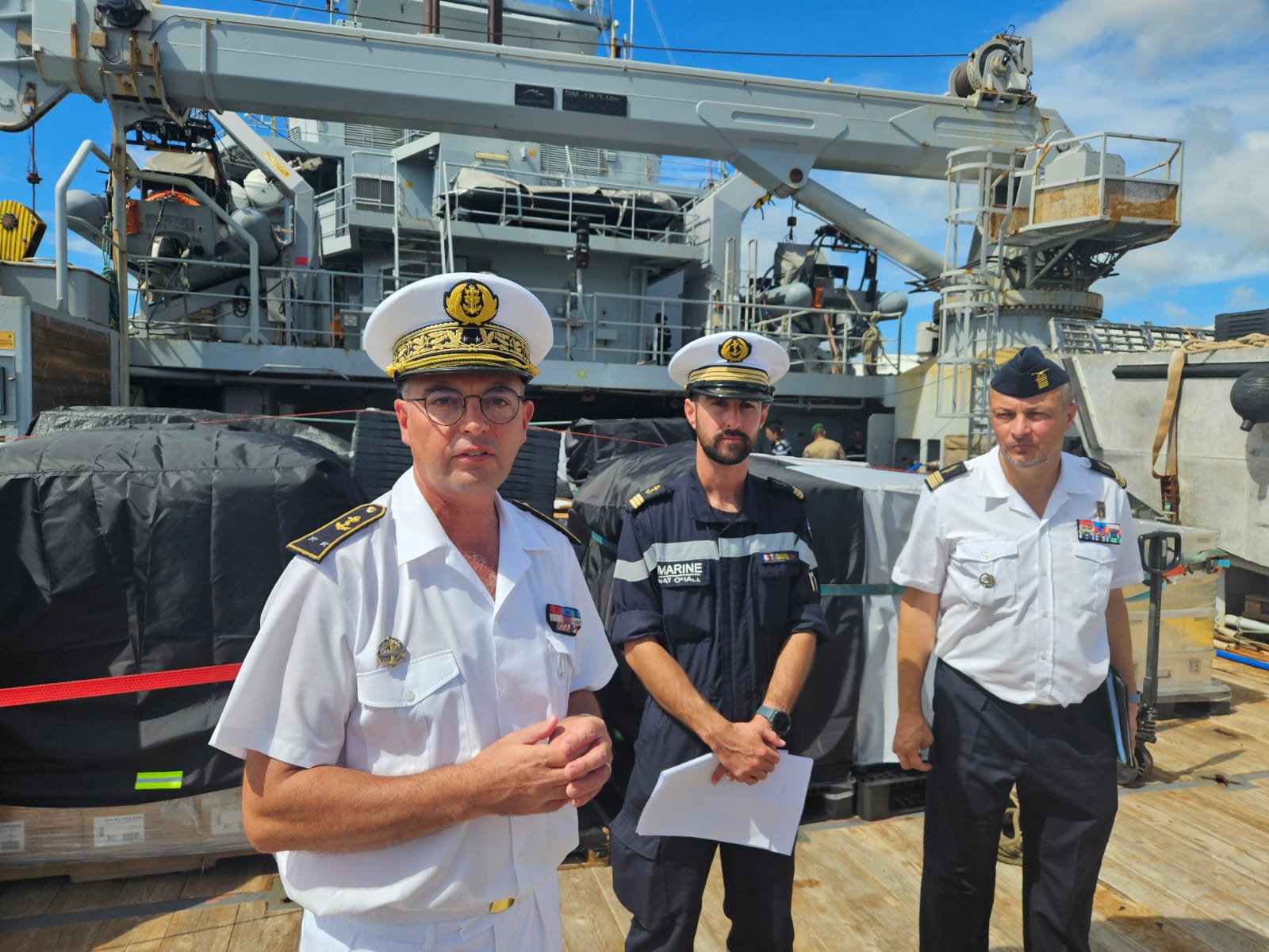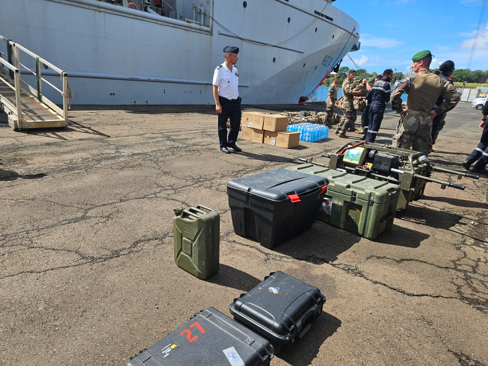 Le Dumont d’Urville était en mission de surveillance maritime, dans le cadre de la lutte contre le trafic de drogue. J'ai réorienté sa mission et dès hier, je l'ai envoyé à la Barbade commencer à charger du fret humanitaire. Le fret, ce jeudi (30 octobre), il s'arrête 1 h 30 à Fort-de-France, juste pour faire son propre ravitaillement en nourriture pour la mission qui va durer et embarquer également des gens du 33ᵉ régiment d'infanterie de marine pour aider aux manipulations de chargements-déchargements pour gagner du temps. Le fret qu’il y a à bord correspond bien à un dialogue que j'ai eu avec tous les partenaires dans le domaine de l'humanitaire, ici, au Caraïbes. Premièrement, l'ambassadrice de Jamaïque. Ensuite, la délégation de l'Union européenne, qui est présente à la Barbade. Différentes organisations humanitaires de l'ONU. Enfin, avec la Caricom, dont la Martinique est membre associée, leur organisme de gestion de crise, la CEDEMA. Et enfin, la Croix-Rouge, avec la PIRAC, qui est stationnée en Guadeloupe et où le bateau va aller, ce jeudi soir, prendre le reste du chargement.