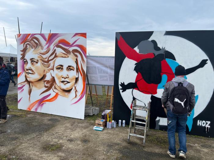 Pour évoquer les thèmes de la mémoire de l'esclavage, mais aussi de la fraternité, le graffeur HOZ, venu de Quimper, a réalisé une fresque en direct.