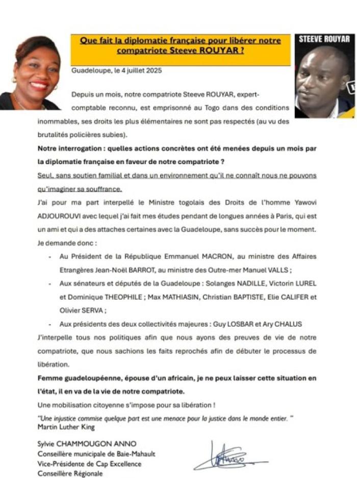 A noter que dans un courrier du 19 juin dernier, Max Mathiasin, député de la 3e circonscription de Guadeloupe, a pour sa part demandé à Jean-Noël Barrot, ministre de l’Europe et des Affaires étrangères, des informations concrètes sur la situation de Steeve Rouyar, emprisonné au Togo.