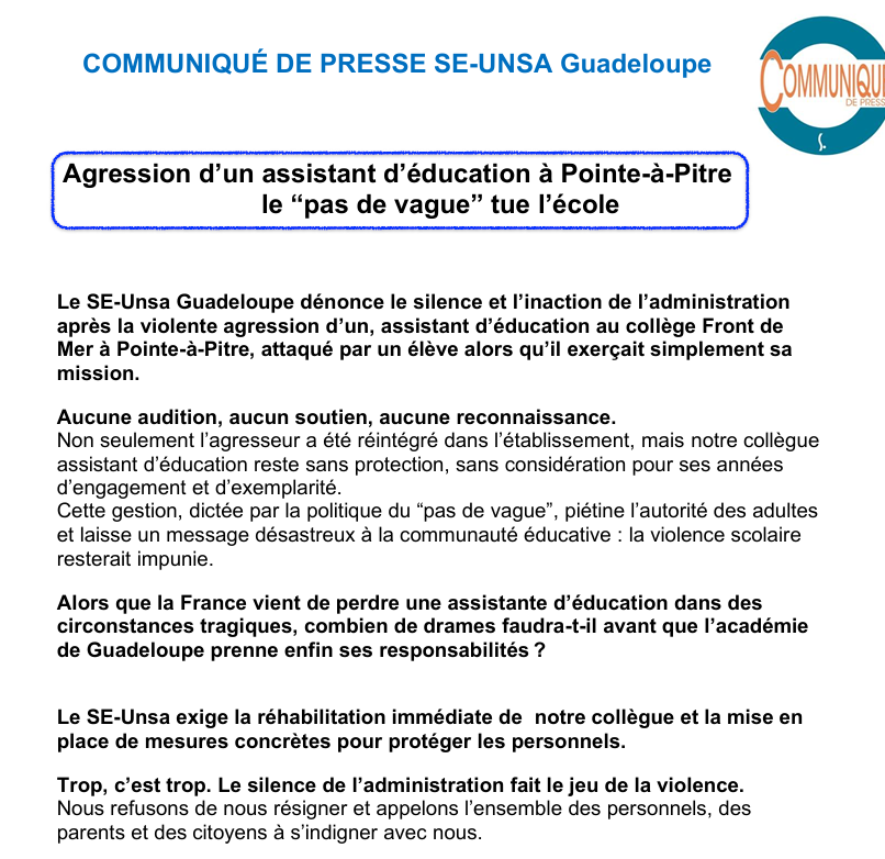 Vous savez, les assistants d'éducation (AED) ont en charge la sécurité des personnels. Ils s'occupent aussi, plus précisément, de l'encadrement des élèves. Là, il y avait du chahut dans une salle de permanence. Le collègue en question a fait comprendre à l'élève qu'il fallait sortir parce que son comportement n'était pas adéquat. L'élève a pris une roche et l'a balancée sur la tête de l'assistant d'éducation. Le conseil de discipline – les parents d’élèves et les enseignants –s'est réuni, et a décidé, à l'unanimité, de sanctionner l'élève en le renvoyant définitivement. Les parents ont fait un recours. Il y a eu une commission d'appel au rectorat. L'élève a été réintégré dans le collège. Donc vous comprenez bien que ça a créé l'émoi, parce que du coup, c'est l'autorité des enseignants, des assistants qui est fragilisée. Le SE-UNSA Guadeloupe dénonce l'attitude du rectorat. Il y a des problèmes, mais bon, on n'en parle pas trop. Et puis surtout, on a l'impression de ne pas être accompagnés. Qui est la victime ? Qui est le coupable ? Je crois qu'il y a une seule victime. Demain ou après-demain, on sait très bien que ça peut être autre chose. Je fais allusion à ce qui s'est passé en France il y a deux ou trois jours. On voit bien que ce n'est plus du fantasme ce qu'on dénonce. L’académie de Guadeloupe ne l'a pas encore bien compris, ne l'a pas encore bien saisi.