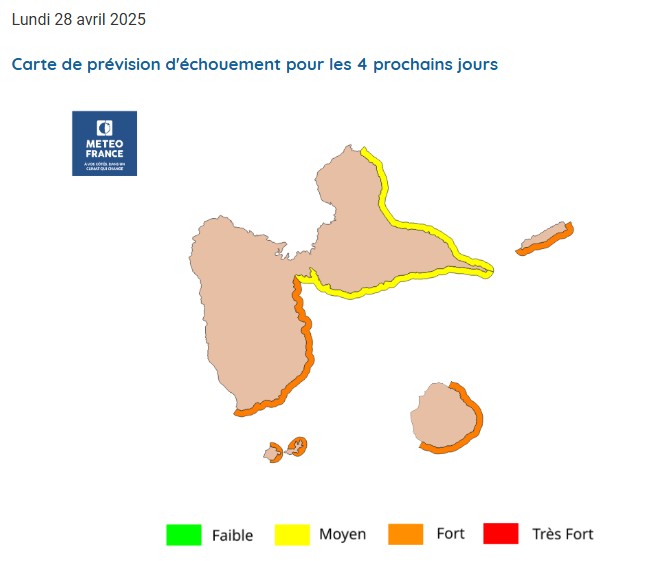 Dans un flux de secteur Est, en sortie d'un gyre au large de la Dominique et de l'entrée du Canal éponyme, l'océan est chargé d'algues qui sont redirigées vers nos îles. Les arrivages nombreux et répétitifs sont donc encore d'actualité sur le littoral exposé au flux.