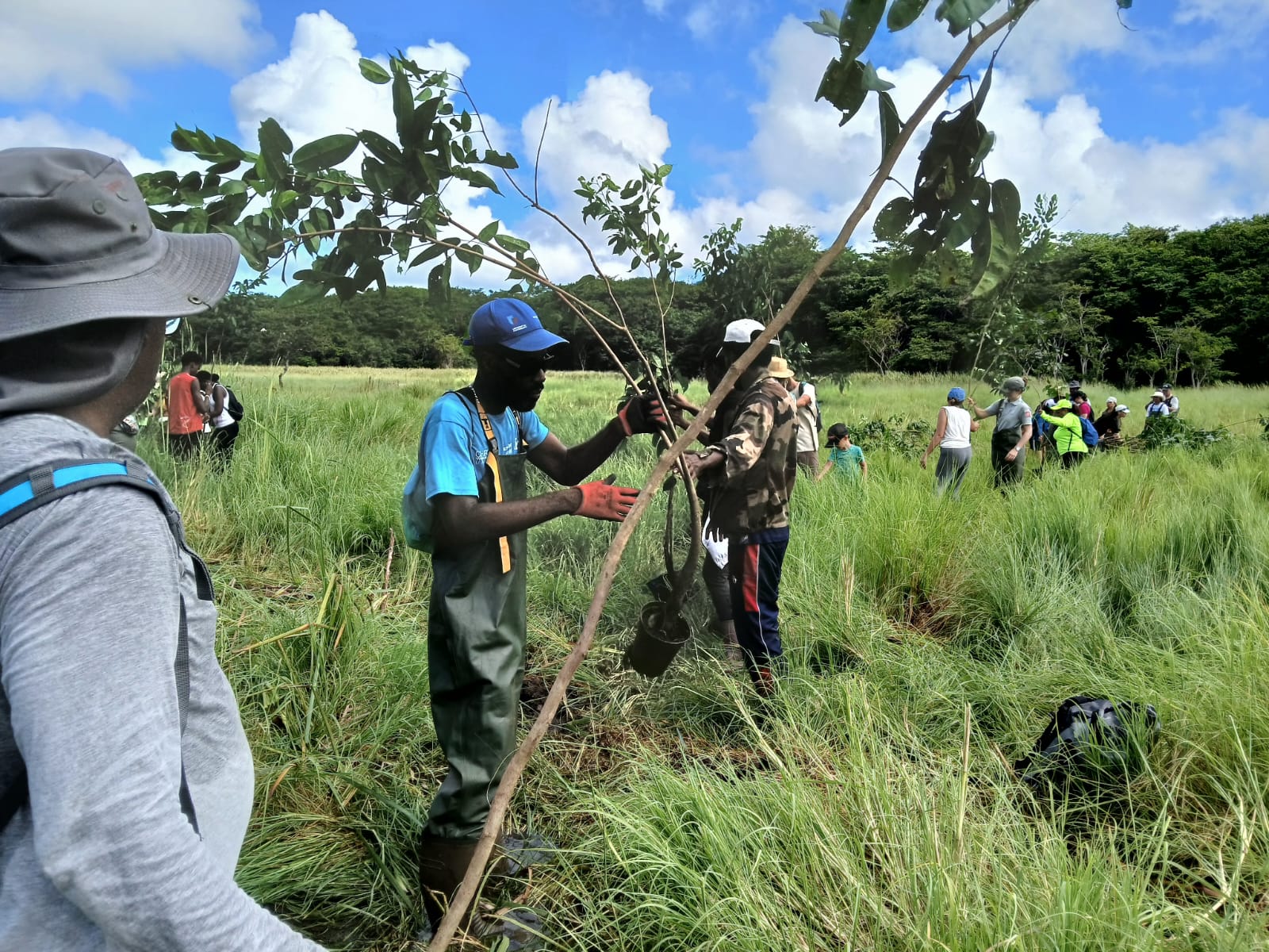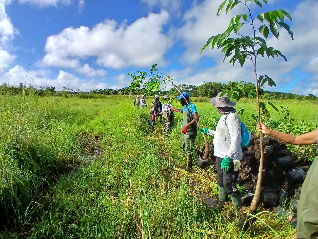Le projet, qui a débuté en 2018, consiste en la plantation de pieds de mangles médaille, l’arbre emblématique de la forêt marécageuse.