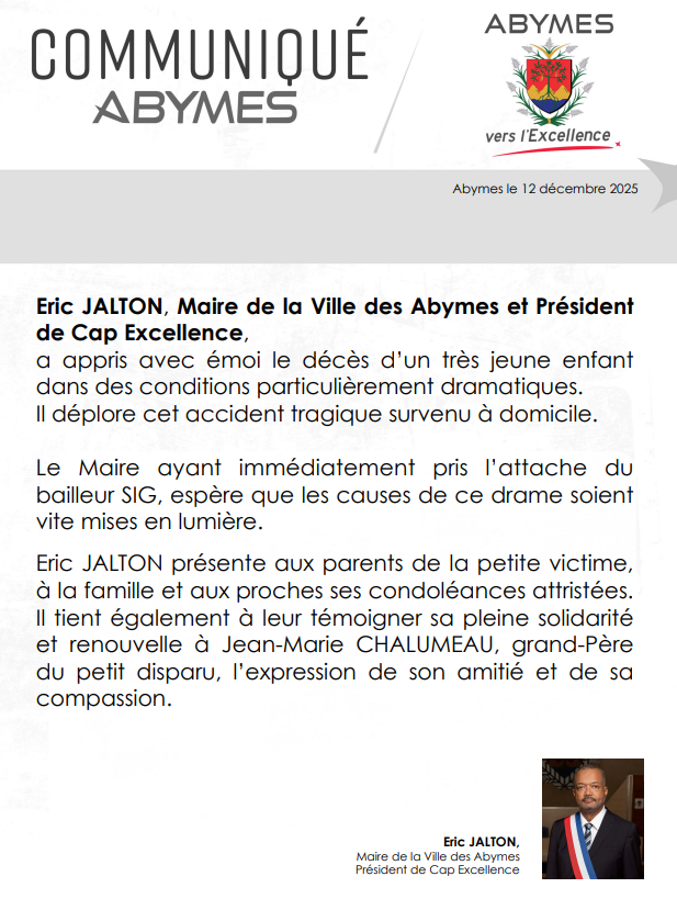 Un tragique accident s'est déroulé ce vendredi matin (12 décembre) aux Abymes. Selon le maire, un enfant a perdu la vie à domicile dans une résidence. Il demande à faire la lumière sur ce décès.
