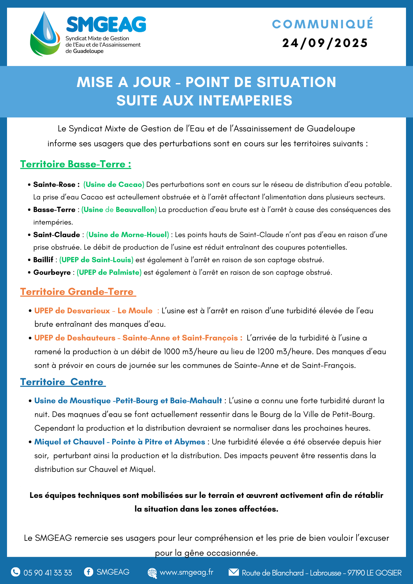 Les fortes pluies provoquées par le passage de l'onde tropicale 28 ont engendré des perturbations dans la distribution de l'eau dans plusieurs communes de Guadeloupe. Celles de la Basse-Terre sont particulièrement touchées.