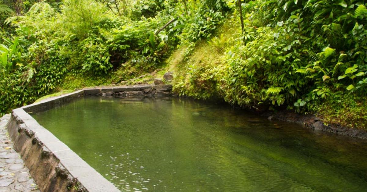Le bassin des Bains Jaunes, qui exploite l'une des nombreuses sources d'eau soufrée naturelles qui descendent du volcan, est un lieu de détente très prisé des visiteurs et de réconfort pour ceux qui reviennent de la longue marche jusqu'à la Soufrière, point culminant de notre archipel.