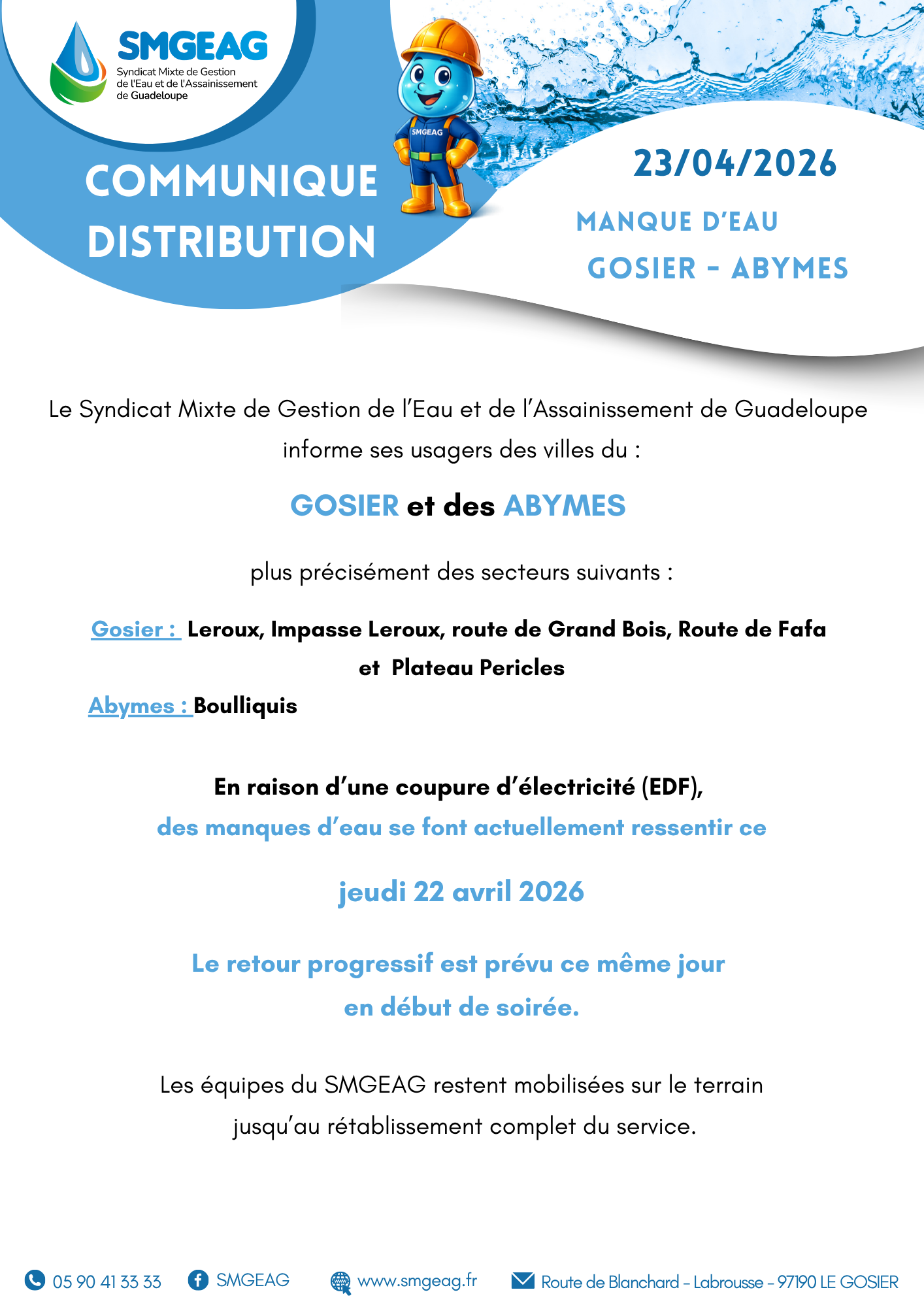 Ce jeudi 23 avril, le SMGEAG informe les usagers des villes du Gosier et des Abymes qu'en raison d'une coupure d'électricité touchant les installations EDF, des perturbations dans la distribution d'eau sont actuellement constatées.
