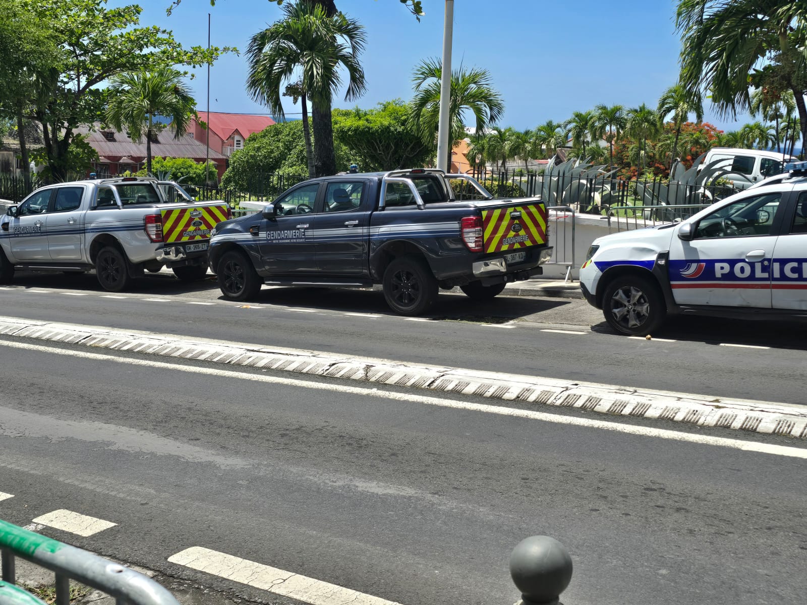 Une vingtaine de fonctionnaires du commissariat du chef-lieu et de la compagnie départementale d'intervention (CDI) de Point-à-Pitre se relaient aux abords du bâtiment et à l'intérieur de la salle d'audience.