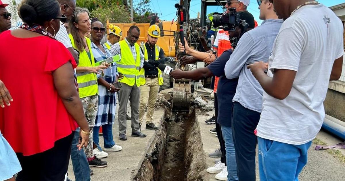 Avant de se rendre sur le chantier de Baillif, Ary Chalus est allé visiter le chantier en cours à Saint-Claude, où la Région réalise une enveloppe de travaux d’un peu plus de 2 millions d’euros visant à améliorer la distribution en eau sur quatre secteurs, comme l’explique Emmanuelle Clemessy.