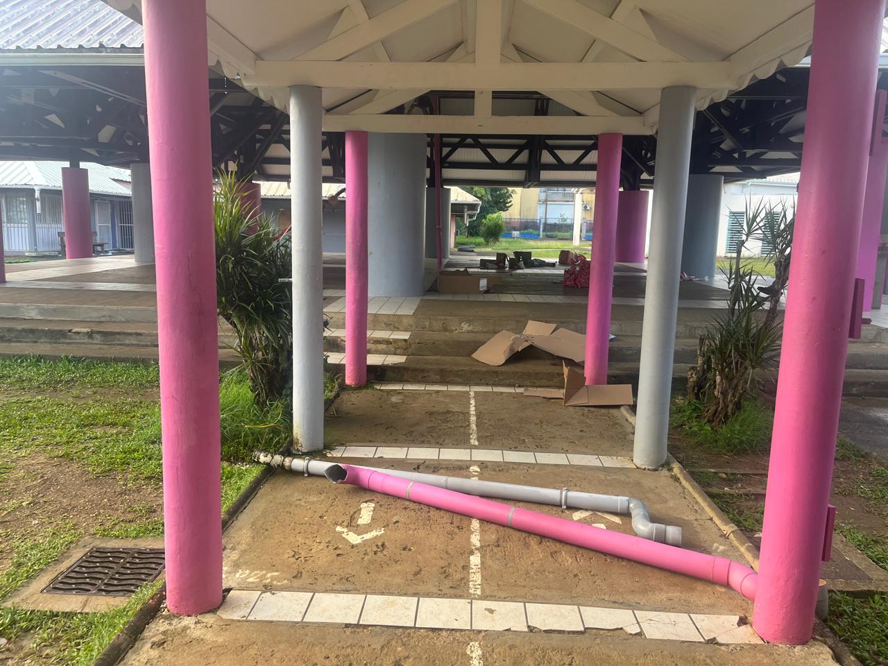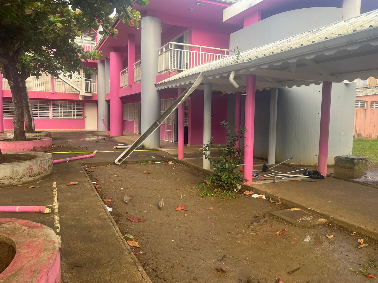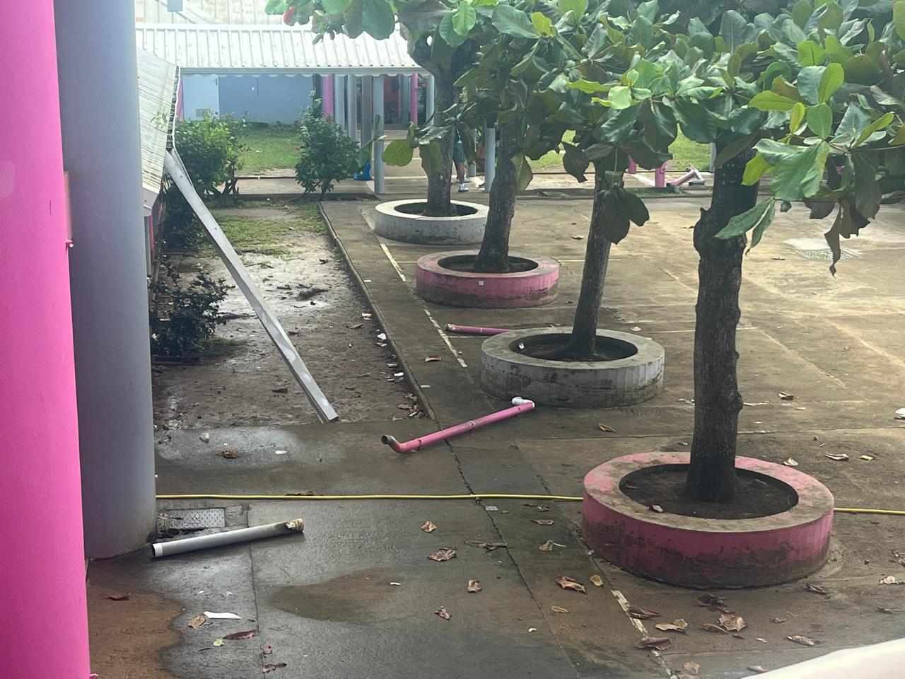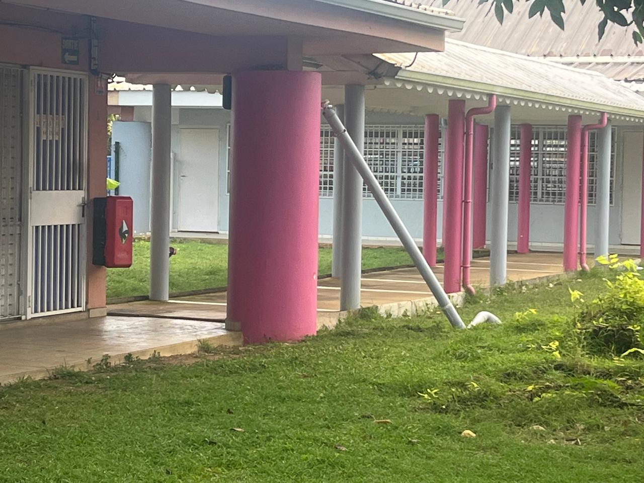 Des débris qui jonchent le sol, les gouttières arrachées ont été replacées à des endroits incongrus, des bris de verre issus de tentatives d’intrusion dans certains locaux. Le spectacle de la cour du collège de Grand-Camp fait peine à voir. Mais ce n’est pas une première, les enseignants ont déjà connu des intrusions similaires comme l’indique une enseignante.
