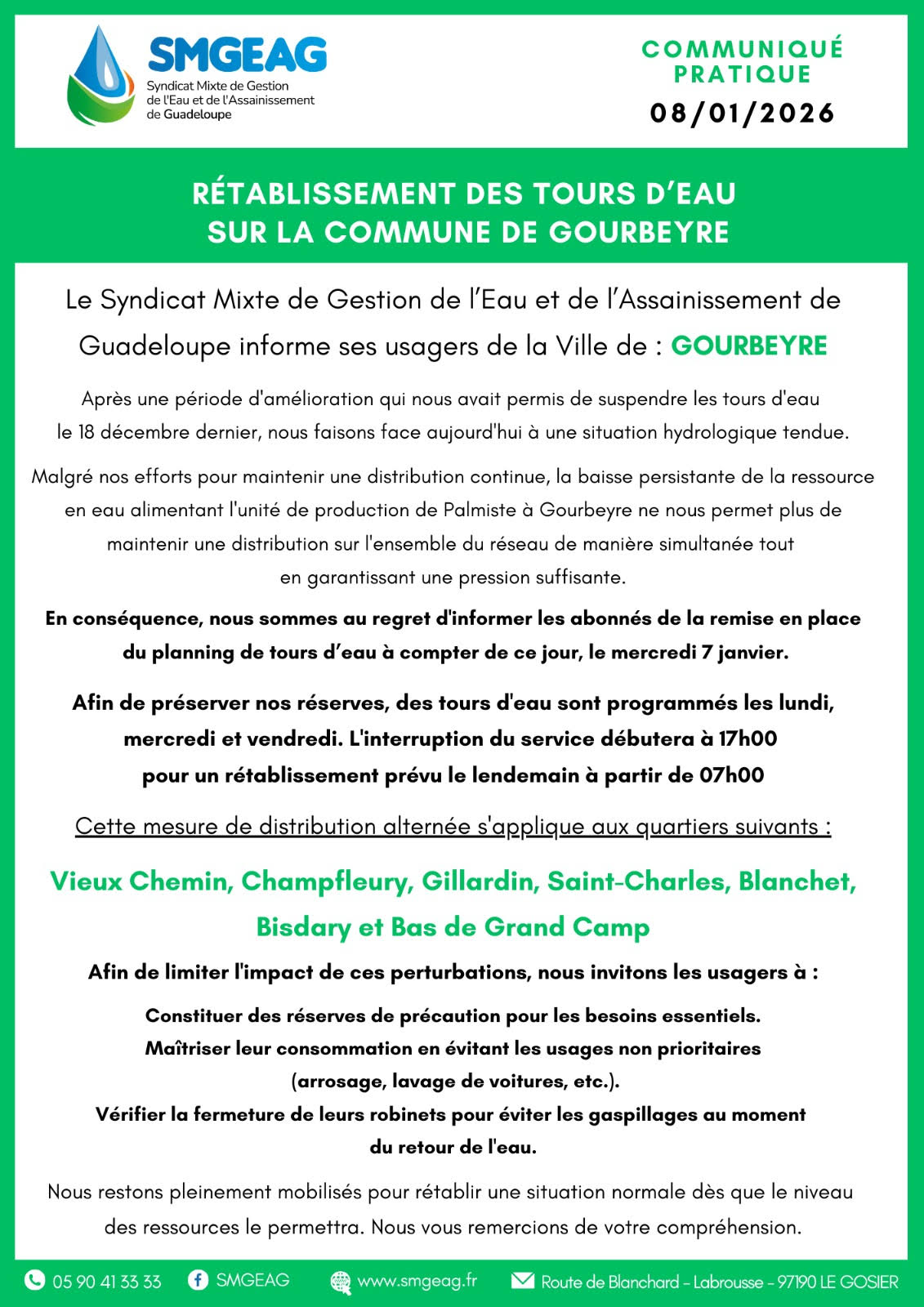 Le SMGEAG annonce le rétablissement des tours d'eau dans sept sections de Gourbeyre