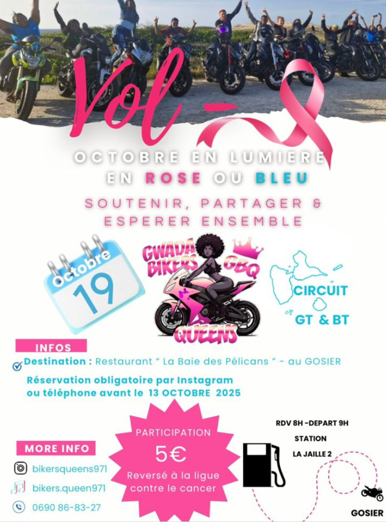 Après la journée "bleue" sur le deuil périnatal et à l'occasion "d'Octobre Rose", l'association des motardes du Gwada bikers Queen organise une sortie moto ce dimanche (19 octobre). Elles parcourront les routes de Guadeloupe en guise de solidarité.