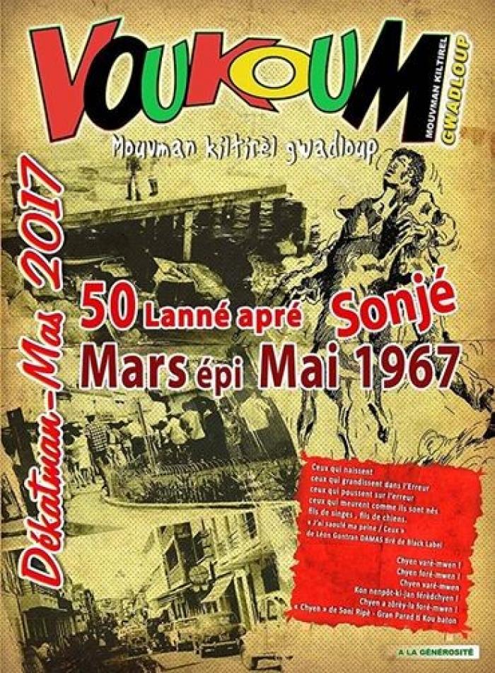 Pour la première fois de son histoire, le mouvement culturel Voukoum arborera une banderole pour défiler dans les rues de Basse-Terre et de Pointe-à-Pitre ce jeudi 23 mars 2017 jour de Mi-Carême à partir de 16 heures. Avec ce geste le groupe entend se souvenir des événements tragiques de mai et mars 67. D'ailleurs, c'est en képi rouge que Voukoum défilera, un costume chargée de sens.