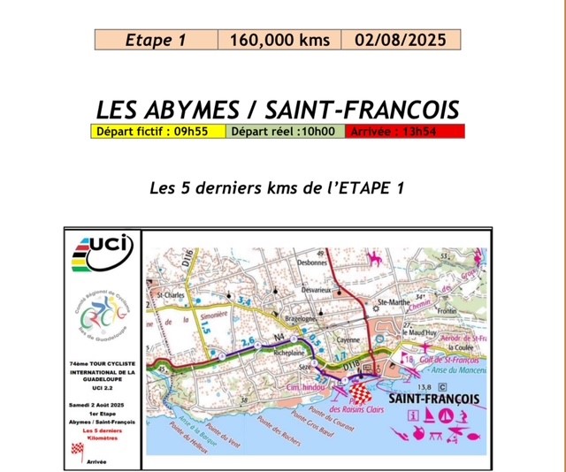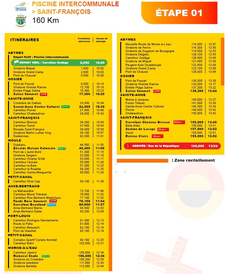 La première étape se dispute entre les Abymes et Saint-François. Un parcours long de 160 kilomètres. 137 coureurs sont au départ.