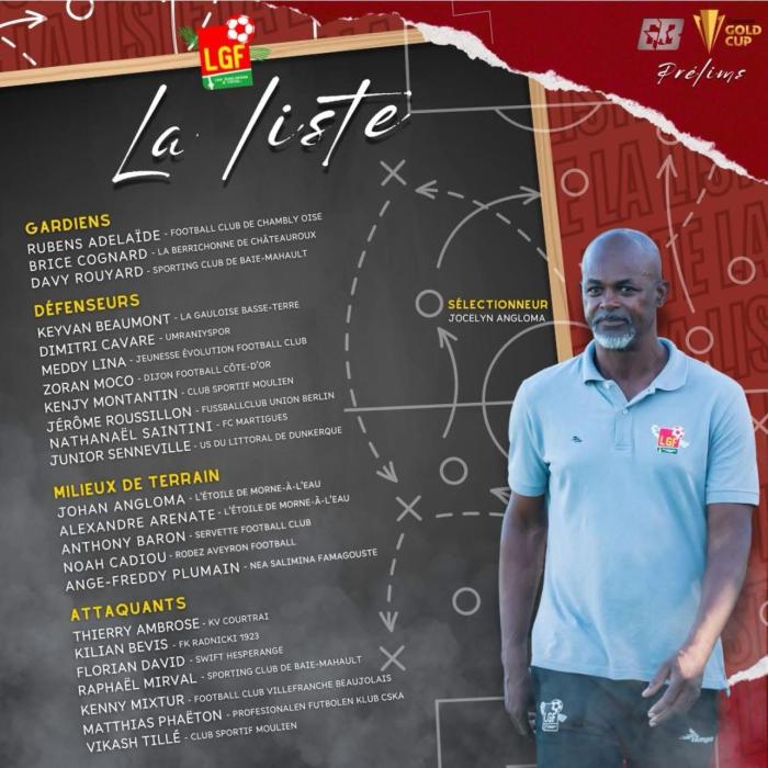 Le sélectionneur Jocelyn Angloma a misé sur un équilibre entre les joueurs locaux et les apports extérieurs. C'est ainsi que nous trouvons au poste de gardien de but Ruben Adélaïde. Brice Cognard et Davy Rouyard. En défense, il a misé sur Keyvan Beaumont, Dimitri Cavare, Meddy Lina, Zoran Moco, Kenjy Montantin, Jérôme Roussillon, Nathanaël Saintini, Junior Senneville. Au milieu de terrain, on retrouvera Johan Angloma, Alexandre Arenate, Anthony Baron, Noah Cadiou, Ange-Freddy Plumain. Et en attaque, Thierry Ambrose, Kilian Bévis, Florian David, Raphaël Mirval, Kenny Mixtur, Mathias Phaëton et Vikash Tillié.