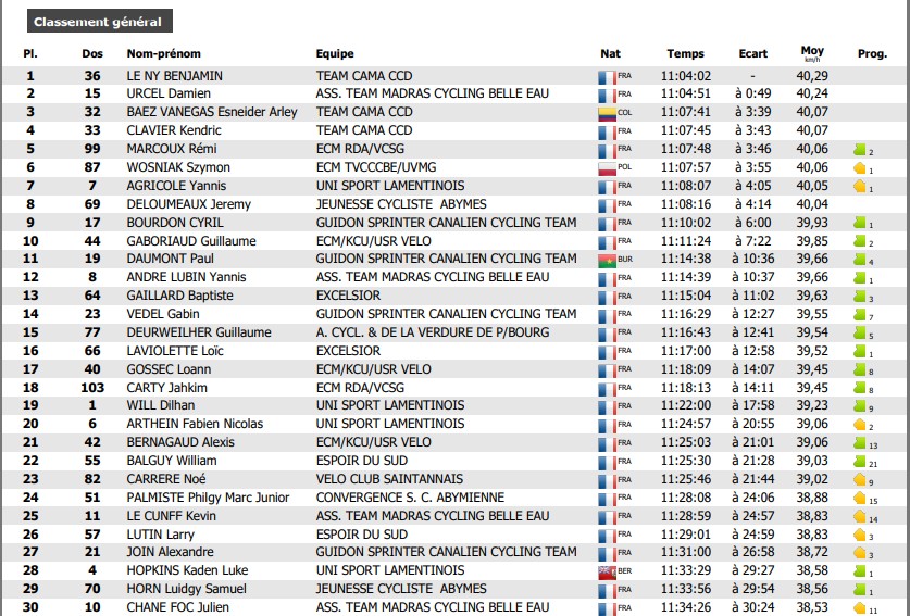 Au terme de 140 kilomètres particulièrement animés, c'est Rémy Marcoux qui s'est imposé à Grand Bourg au terme d'un duel épique dans la dernière ligne droite. Au classement général, Benjamin Le Ny (Team CAMA CCD) est toujours en jaune.