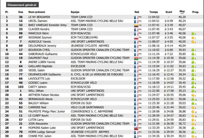 Au général, Benajmin Le Ny conserve son maillot jaune devant Damien Urcel. Pour quatre petites secondes, Esneider Baez Vanegas (Team Cama CCD) est toujours troisième au général devant son coéquipier Kendric Claver. Grâce à sa victoire d'étape, Rémy Marcoux grimpe de deux places au général et intègre le top 5.