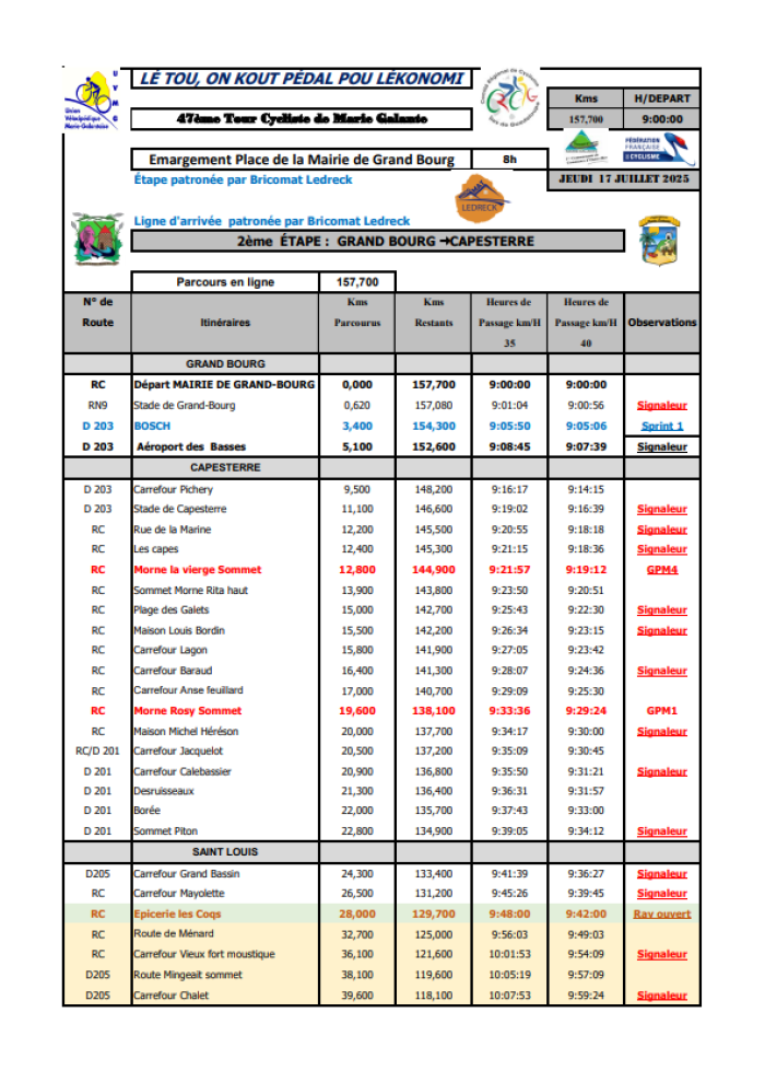 Au programme, un circuit rapide parsemé de huit grand prix montagne (GPM). Au départ de l’aéroport des Basses, les coureurs auront à escalader d’entrée le morne la Vierge à Capesterre suivi rapidement du Morne Rosy.