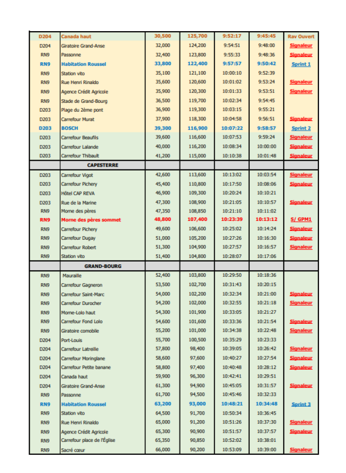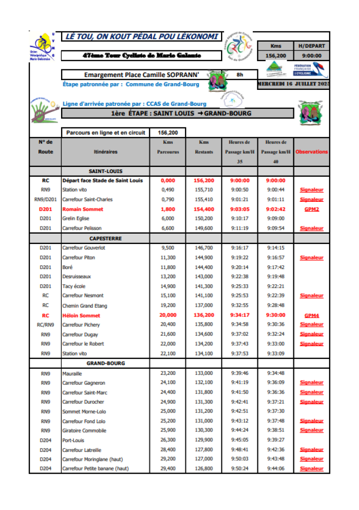 Au programme, une boucle de 156.200km entre Saint-Louis et Grand-Bourg. Sur le parcours, quatre Grand Prix Montagne (GPM) avec l’ascension du Morne Romain, puis tout de suite après celle d’Héloin. Enfin, après 1h30 de course, il faudra effacer le morne de Pères (Capesterre) et le morne Ducos (Grand-Bourg). Il y aura 6 passages sur la ligne d’arrivée avant la fin de la course prévue, au mieux à 13h.