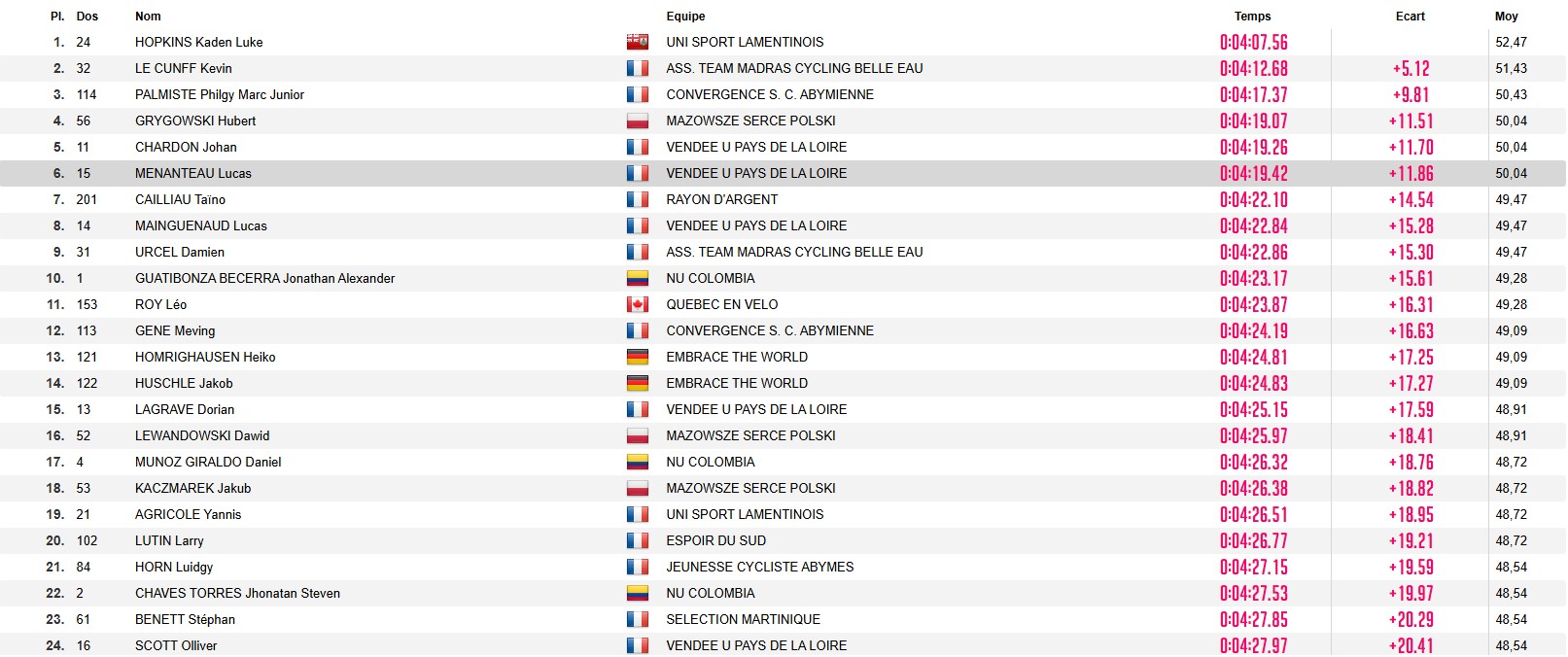 On retiendra aussi la 9e palce de Damien Urcel (TMCBE) et la 46e place Benjamin Le Ny (CAMA CCD), embêté par un problème technique.