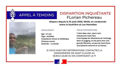 Faits divers 17/08/2025 - 11:08 | Guadeloupe Appel à témoins après la disparition de Florian Pichereau lors d’une randonnée Des recherches sont en cours, ce dimanche (17 août), après la disparition jugée inquiétante de Florian Pichereau lors d’une...