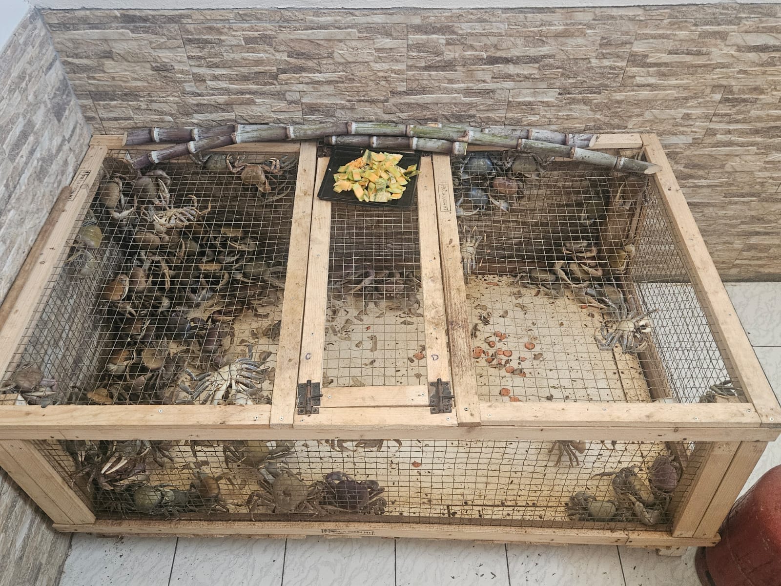 J’ai aménagé un coin spécial pour mes crabes ; chaque année, c'est là que je les installe après avoir tout nettoyé. On partage la maison, ils cohabitent avec moi ! (rires). Je les garde deux mois pour Pâques et un mois pour la Pentecôte. Côté menu, c'est feuilles de fruit à pain, mangues, melons, ananas et pastèques. Pour les légumes, je leur donne du giraumon et de la christophine ; c'est ce qui permet de bien les "soigner" et de faire tomber les poils de leurs pattes. Une fois qu'ils sont propres, je les prépare : je récupère la graisse à part pour les clients, je les brosse, et je les nettoie au vinaigre et à l’orange amère. Qu'ils soient vivants ou déjà nettoyés, le prix est le même : 3 € le crabe.