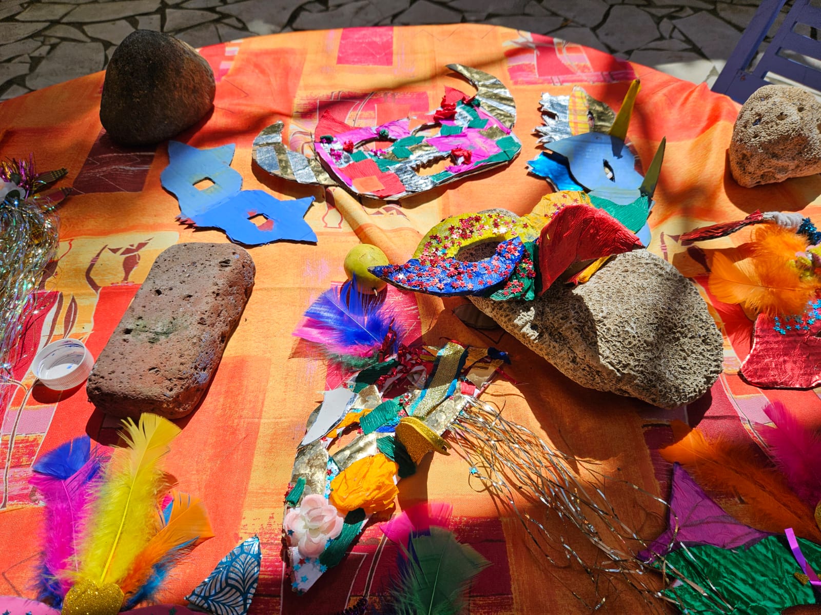 Des masques réalisés sur les conseils de Marie-Ange Bernabé, Youma B de son nom d’artiste. Elle raconte comme se déroule ses ateliers pleins de vie et de créativité
