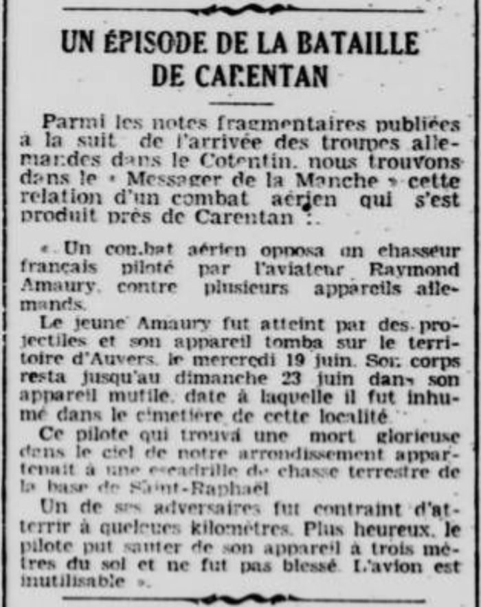 Tombé dans un marais à proximité d'Auvers, le Martiniquais n'a été retrouvé que quelques jours plus tard, mort, ayant vraisemblablement succombé à de graves blessures à la tête et à la jambe. Lors de ce combat, un avion allemand s'est également crashé sur les terres d'une ferme avoisinante, vraisemblablement abattu par Raymond Amory, même si ce fait d'armes ne lui a jamais été reconnu, faute de preuve, mais aussi en raison de la survie du pilote ennemi. Romain Verardo espère d'ailleurs que ces travaux permettront de lui attribuer cette victoire aérienne qui faisait le prestige des pilotes à l'époque, mais aussi pour donner le crédit légitime à cet acte de résistance avant l'heure, en ce jour historique du 18 juin 1940.