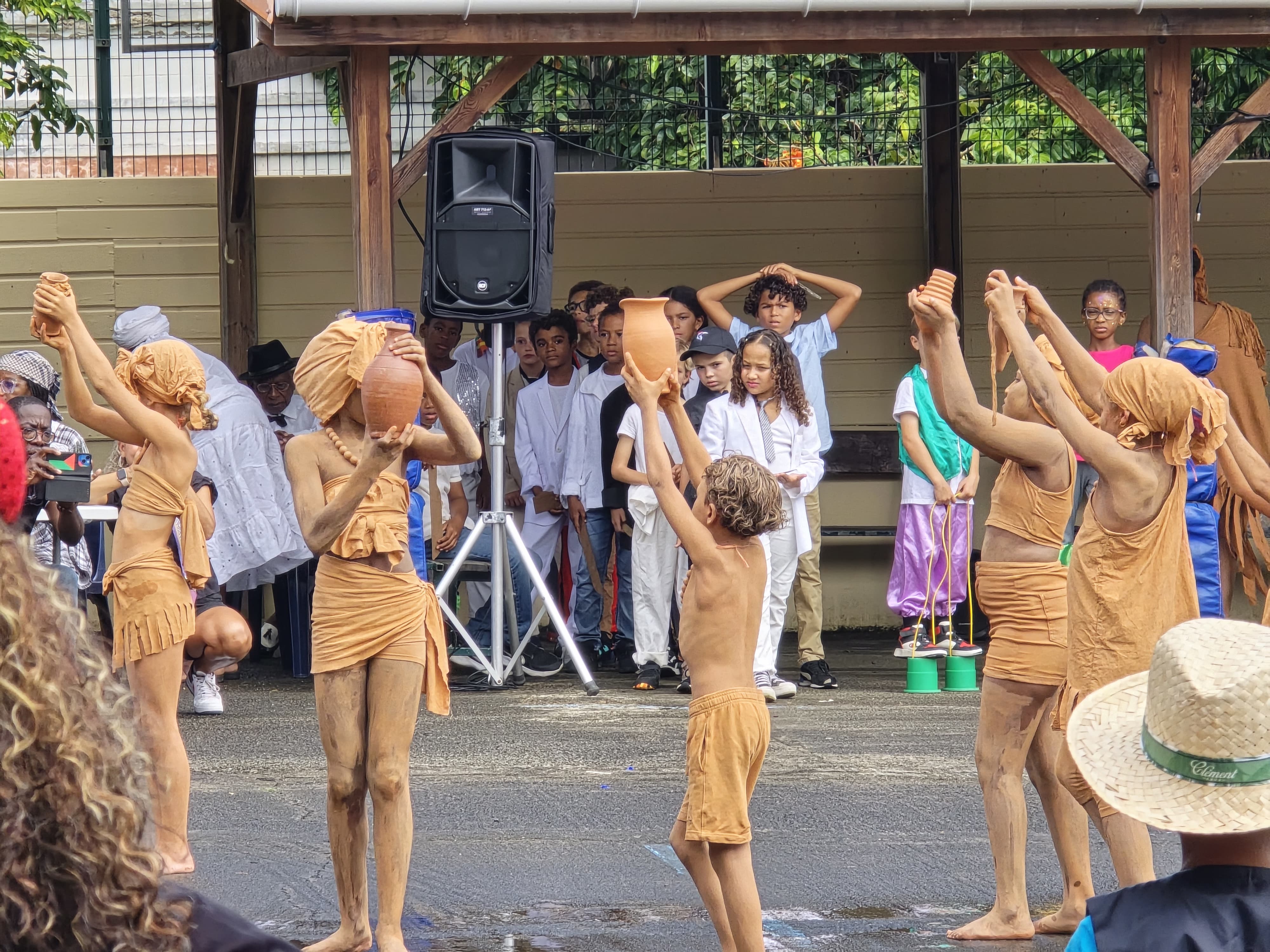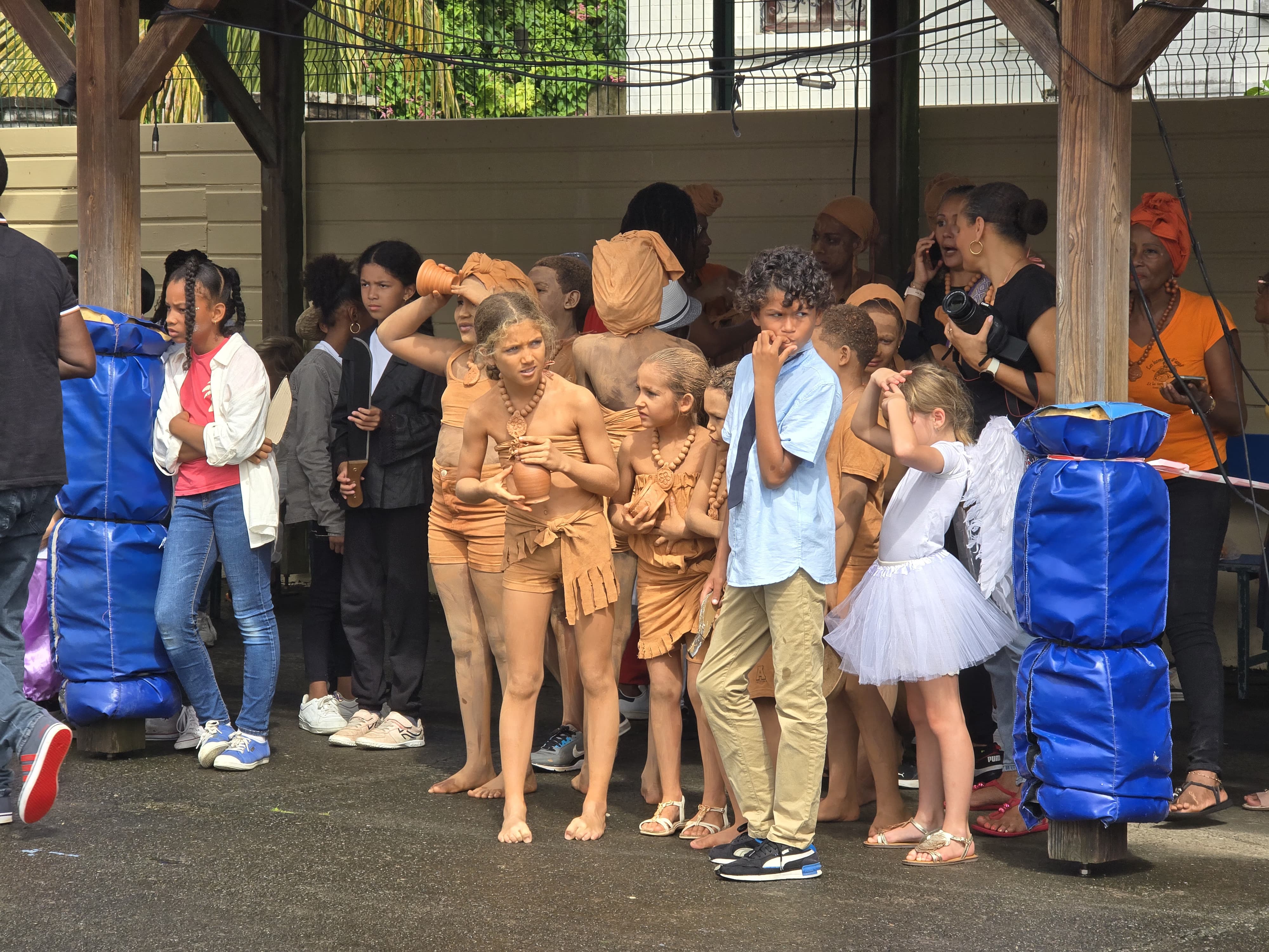 Pour les hommes d'argile, on a eu la chance de rencontrer le potier. Nous sommes partis aux Trois-Ilets, les enfants ont pu former les perles pour former les bijoux. Les vêtements aussi ont été préparés. Tout ça a été tout un travail avec les enfants, bien sûr, les enseignantes. Ensuite, il y a aussi eu tout le travail avec la danse qui était mis en avant, l'expression corporelle, etc. Tout ça, effectivement, ça a demandé un peu plus de travail. Après, ça dépend des costumes qui ont été présentés. La réaction des enfants, au départ, était plutôt mitigée puisqu'on a l'habitude de voir des choses quand même plus colorées, plus pailletées. Mais, à partir du moment où on a expliqué un peu les choses aux enfants, où on leur a présenté ces personnages qui sont uniques au monde, les enfants ont adhéré complètement.