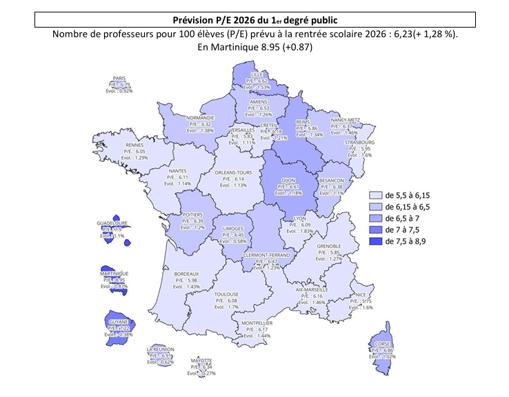 Malgré cette baisse d'élèves, le retrait des postes d'enseignants (ETP) s'effectue à un rythme plus lent, ce qui améliore les taux d'encadrement : ce ratio P/E (nombre de professeurs pour 100 élèves) dans le premier degré public atteindra 8,95 (8,75 en 2025) à la rentrée 2026, contre une moyenne nationale de 6,23. Ce ratio est de 7,9 en Guadeloupe et de 7,22 en Guyane.