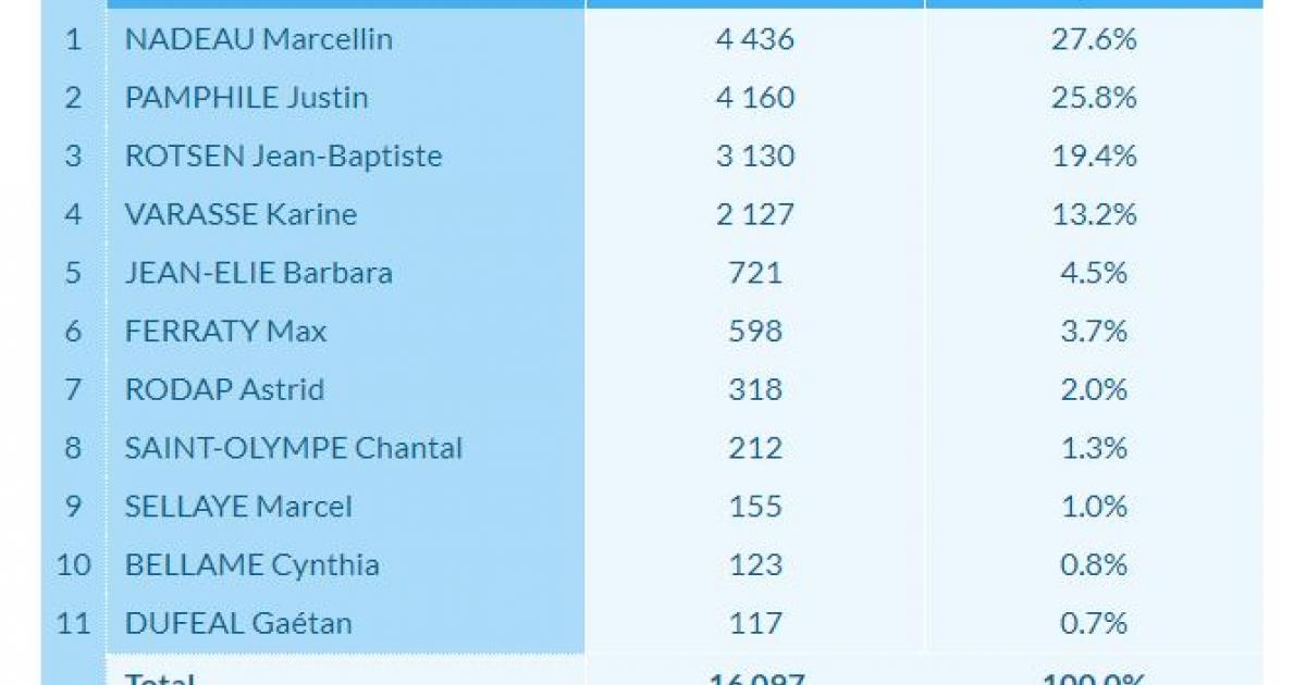 En troisième position, Jean-Baptiste Rotsen aura remporté la victoire uniquement à Sainte-Marie. Le candidat comptabilise 3 130 voix, soit 19,4 %.