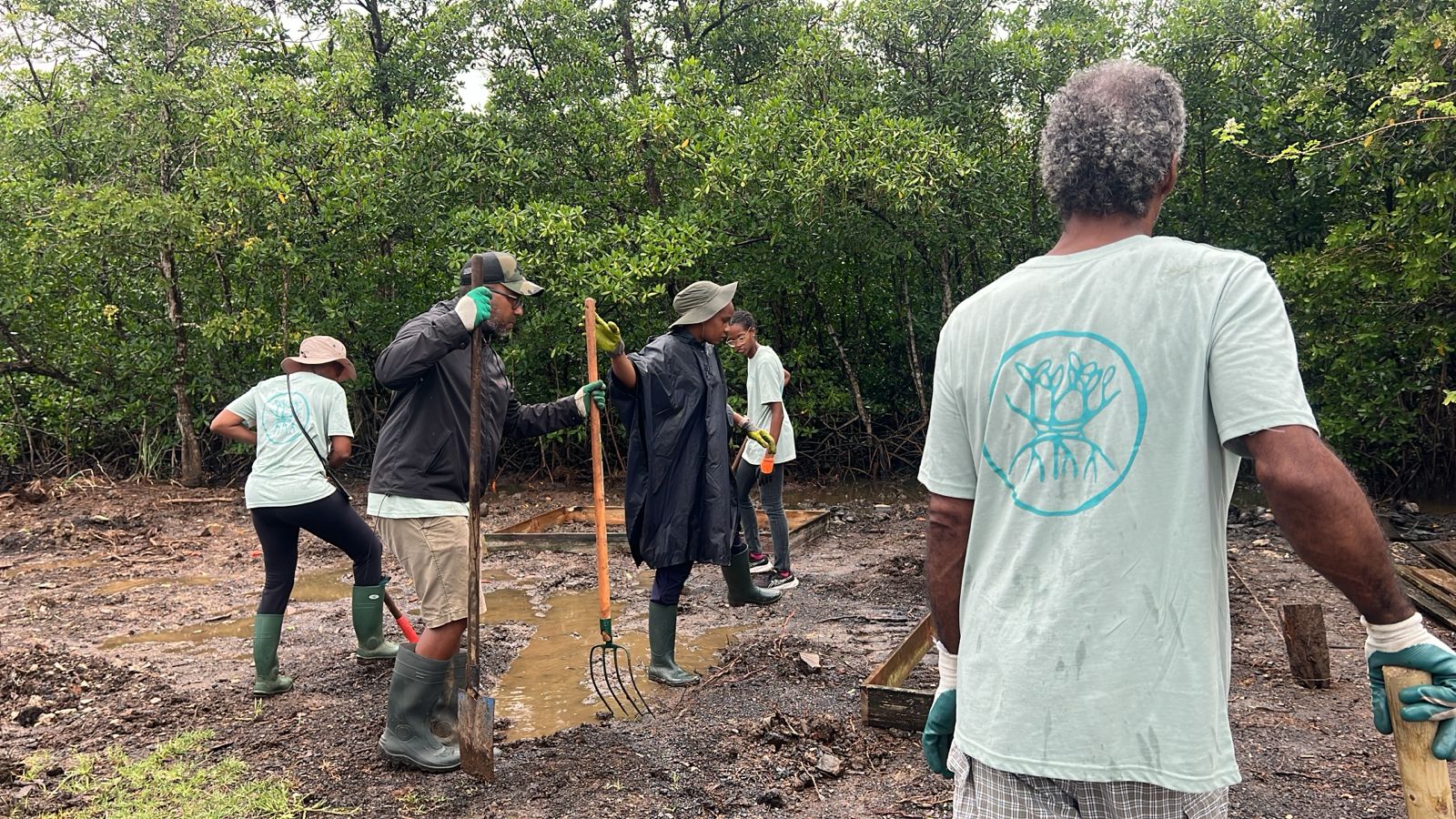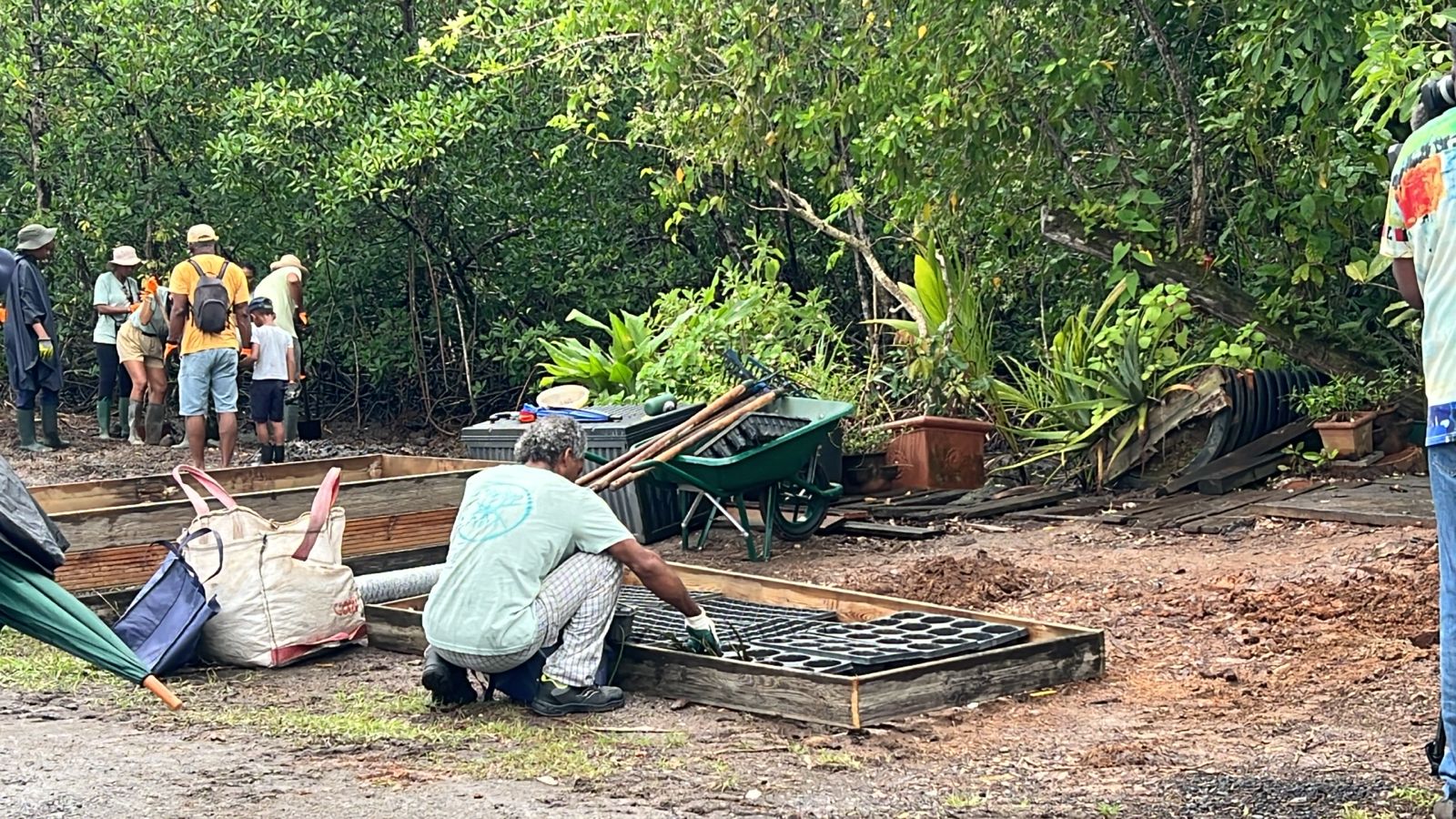 On est en phase de collecte des graines de toute la semence de palétuvier rouge, de palétuvier blanc, à planter dans la pépinière qui est en construction. Ce site a été choisi parce qu'il faut qu'il y ait une proximité avec l'eau pour les palétuviers rouges et puis en amont pour les palétuviers blancs. Comme nous avons découvert des quantités de déchets, des pneus enfouis, il a fallu l'aide d'un engin. C'est un bénévole qui est venu, puisqu'un appel à participation avait été lancé et ça a permis de pouvoir aller plus vite. On essaie de préparer l'assise pour pouvoir installer les semences qui sont dans des casiers. Ça permettra de les replanter, dans quelques mois, dans les zones destinées à cela. On a prévu un espace de 1 800 mètres carrés à replanter pour permettre à la mangrove de prendre un peu plus de place.