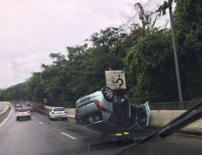 Une voiture a fait une sortie de route, ce jeudi après-midi (28 septembre 2017) juste après le virage de Madiana, dans le sens Schoelcher Fort-de-France. Elle s'est alors retrouvée sur le toit provoquant au passage d'importants ralentissements aux alentours.