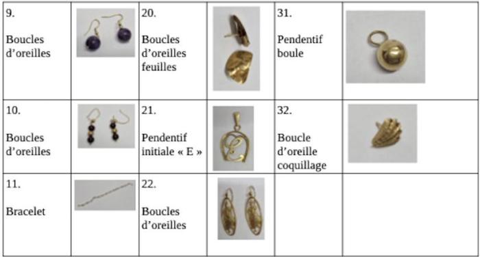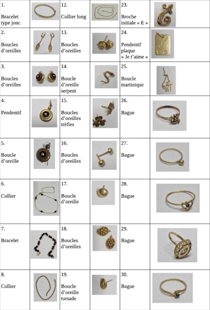 Afin de retrouver les victimes potentielles et restituer les bijoux à leurs propriétaires respectifs, la gendarmerie lance un appel à témoins et diffuse des planches photographiques des objets saisis.