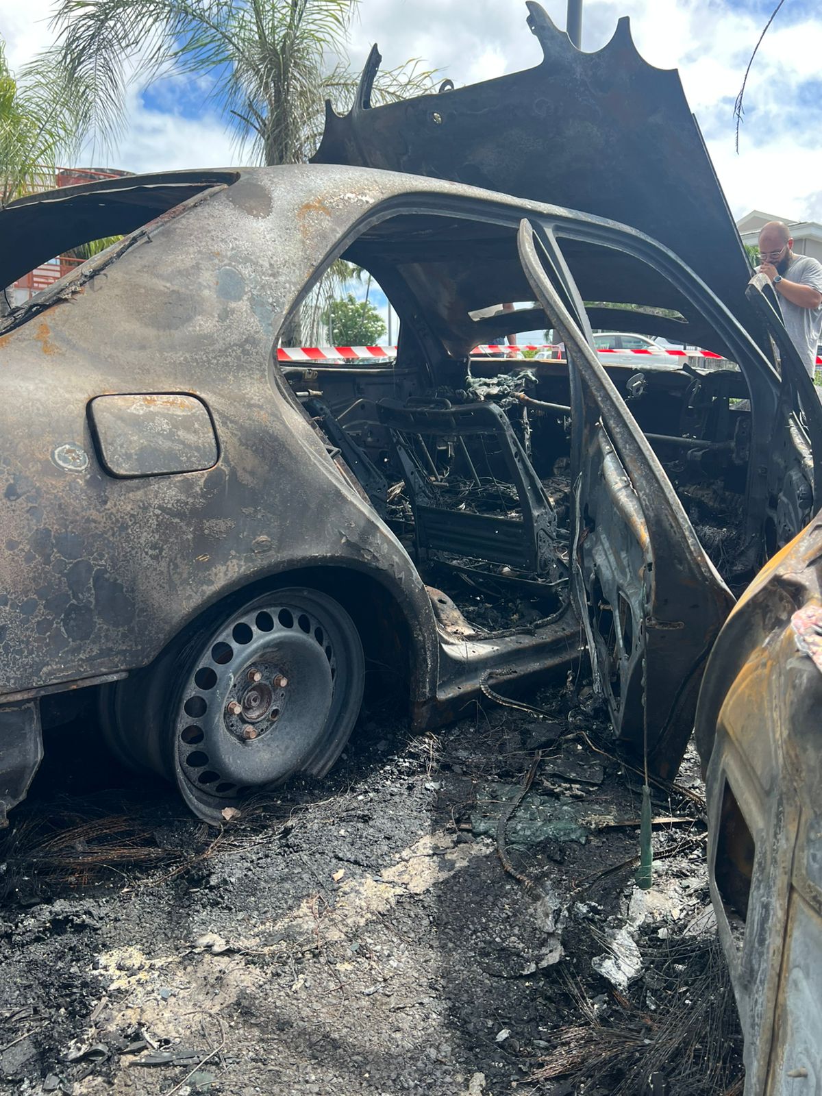 Mes parents étaient au casino, moi j'étais à l'extérieur. Il y a une voiture qui a pris feu et quand on est sorti, il y en avait déjà deux en feu. Ensuite, celle de devant a pris feu. C'est mon véhicule qui a pris feu en dernier. C'est une 208. Elle est dans un vieil état. C'est à la casse qu'elle ira. Quand on est sorti, il était déjà trop tard. Je suis démoralisé. Il y avait le siège auto de ma fille, son carnet de santé. Je ne pourrai pas aller travailler, je ne pourrai pas emmener ma fille à l'école
