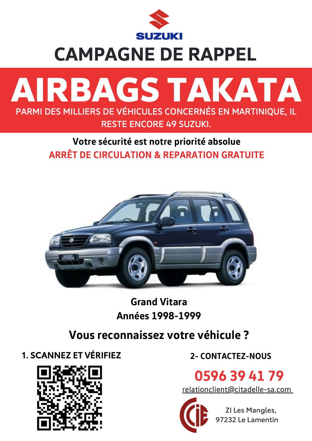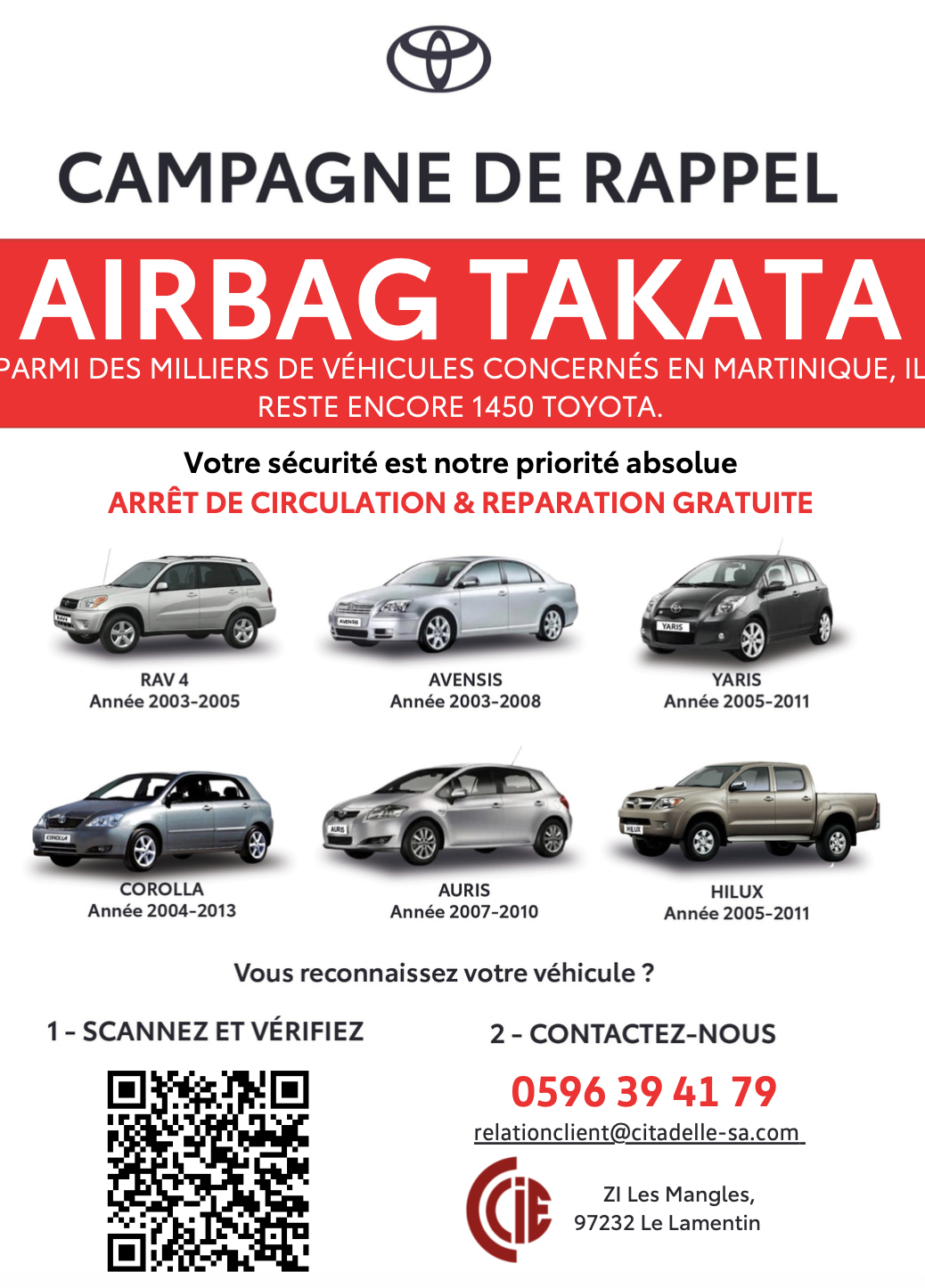 Depuis 2014, Toyota a organisé de nombreuses campagnes de rappel Takata à travers le monde. Grâce à ces campagnes, le CCIE a pu changer 6000 airbags sur des véhicules Toyota en Martinique, mais il reste encore 1450 véhicules dangereux à retrouver. Similairement, il nous reste 49 véhicules Suzuki et 14 véhicules Lexus concernés par le rappel Takata à retrouver et sécuriser.
