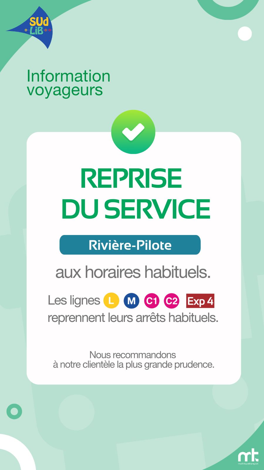 Après une interruption des bus à Rivière-Pilote pendant environ 1 heure ce matin, le Réseau Sud Lib a finalement repris. Les lignes L, M, C1, C2, Exp 4 fonctionnent à nouveau.
