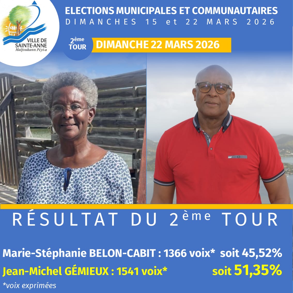 - Sainte-Anne : Jean-Michel Gémieux (53,01%, 1541 voix)