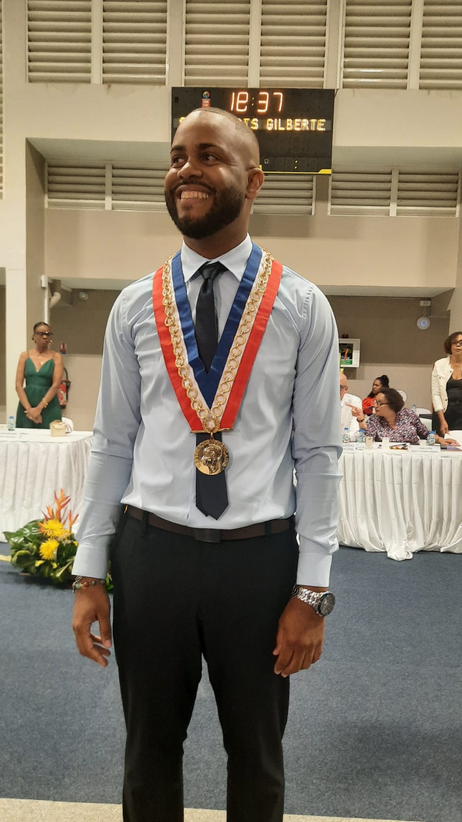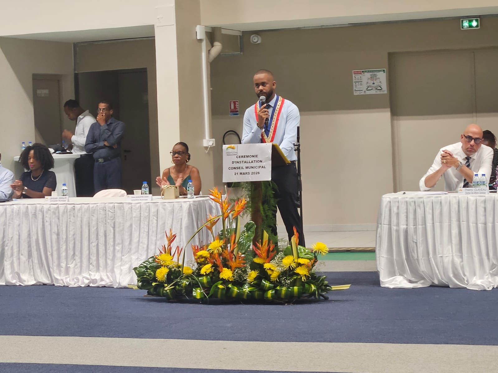 Lionel Grandin a pris officiellement ses fonctions de maire au Hall des sports Gilberte Grandin Saussay transformé en salle de conseil municipal géant pour l’occasion.