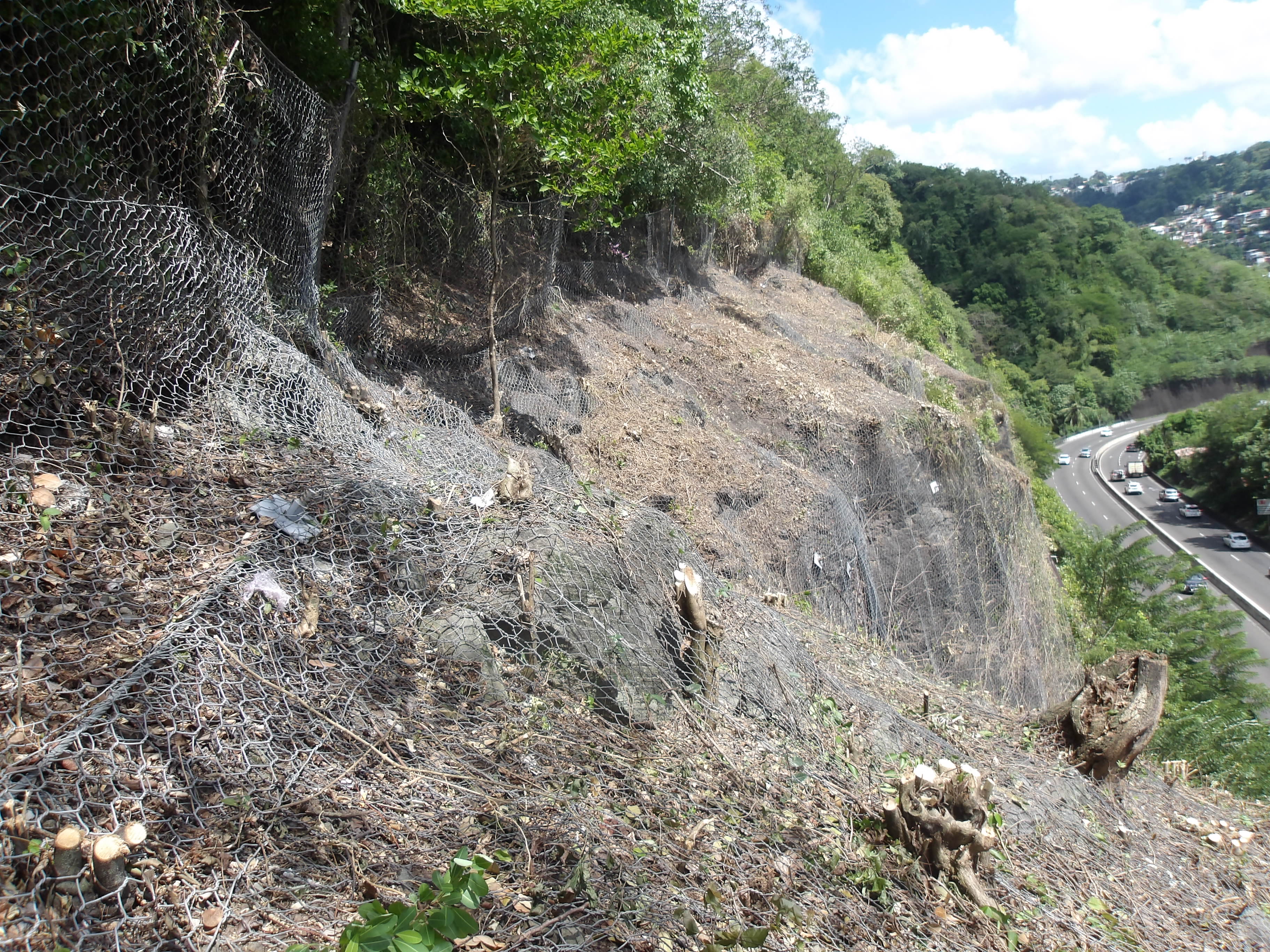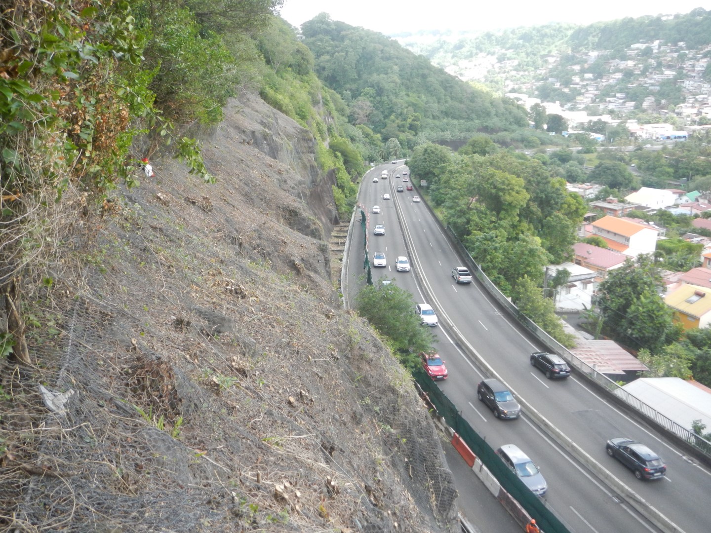 Nature très fracturée, altération des roches ou encore, pluviométrie importante, du fait de son relief, la Martinique est exposée à un fort aléa de chutes de blocs rocheux. Le risque concerne notamment le réseau routier implanté localement à flanc de falaise.