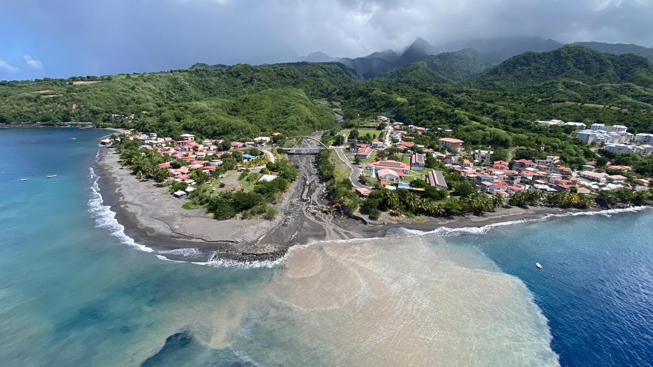 Entre les fortes pluies qui accélèrent l'érosion et provoquent des torrents de boues volcaniques, des engins de chantier travaillent à déblayer l'embouchure de la rivière où les plus gros rochers ce sont accumulés.