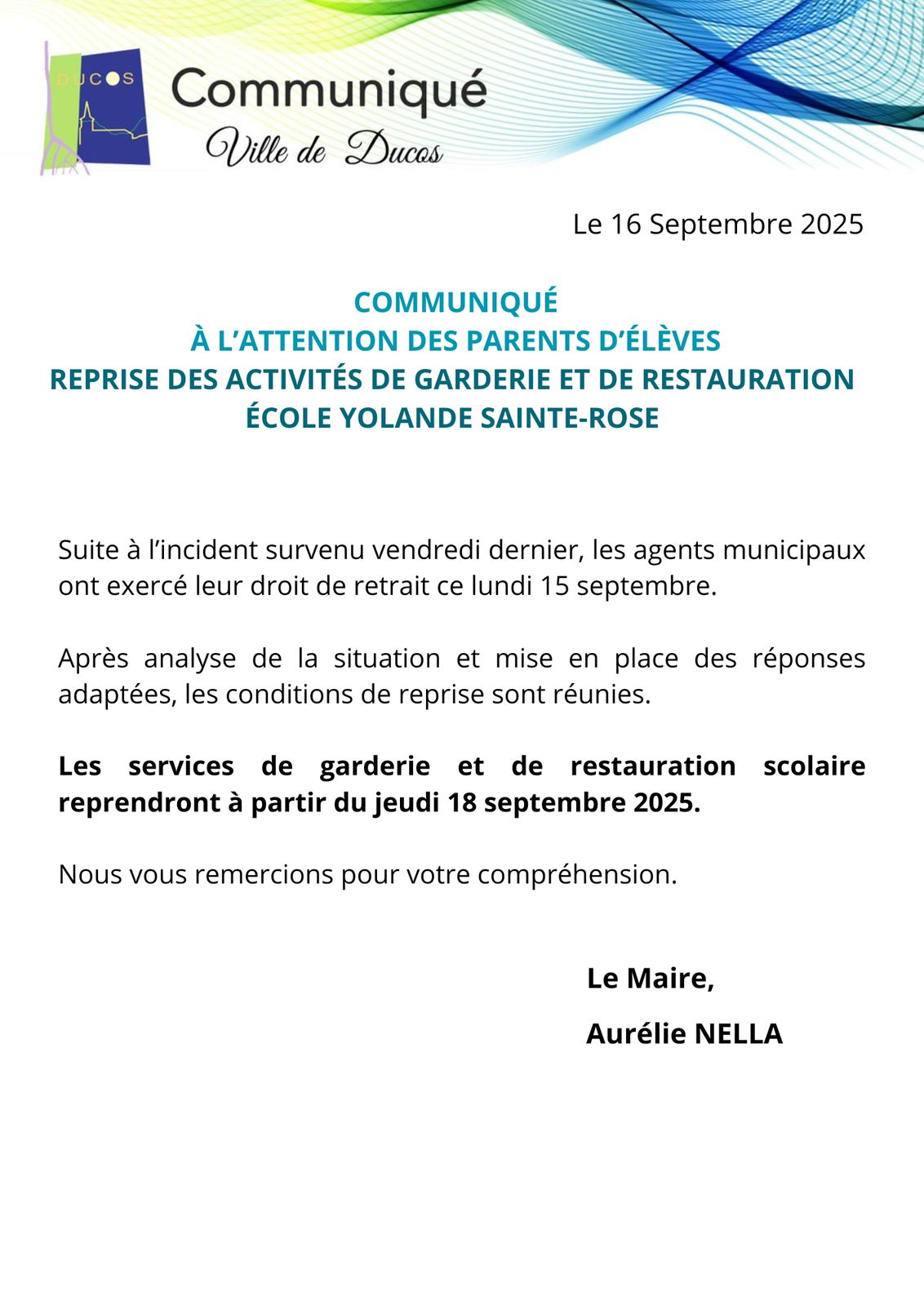 La restauration scolaire et la garderie n'ont pas été assurées lundi et mardi (15 et 16 septembre) à l'école Yolande. Le personnel municipal affecté à l'établissement a fait valoir son droit de retrait. Un agent a été agressé vendredi dernier par un élève qui lui a lancé une chaise. Une solution a finalement été trouvée.
