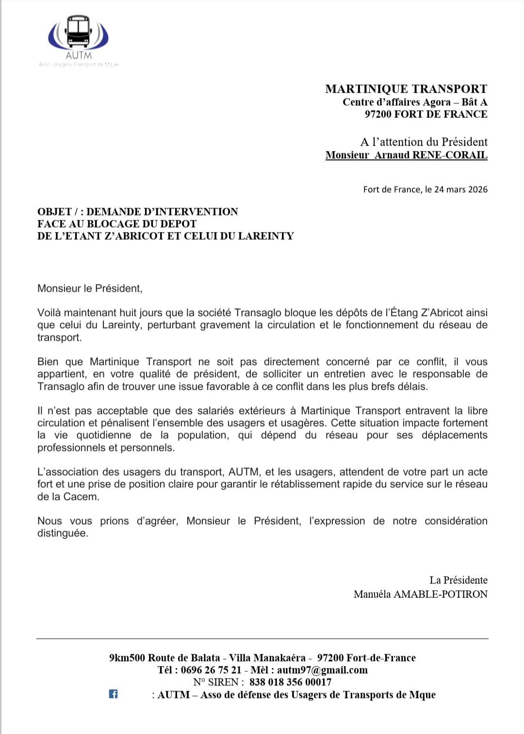 Face à cette paralysie qui s'éternise, l'Association des Usagers des Transports de Martinique (AUTM) interpelle officiellement les autorités.