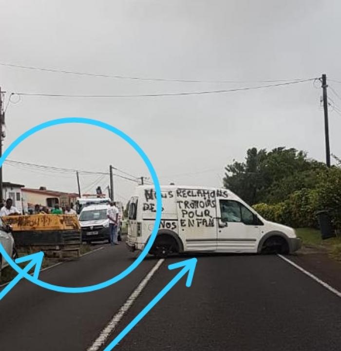 Deux carcasses de voitures entravent la circulation au niveau du quartier Bélème au Lamentin. Sur l'une d'entre elle on peut lire l'inscription suivante : "Nous réclamons des trottoirs pour nos enfants".
