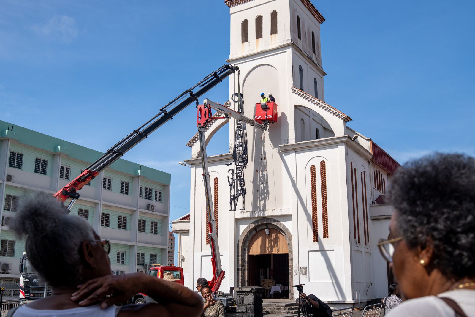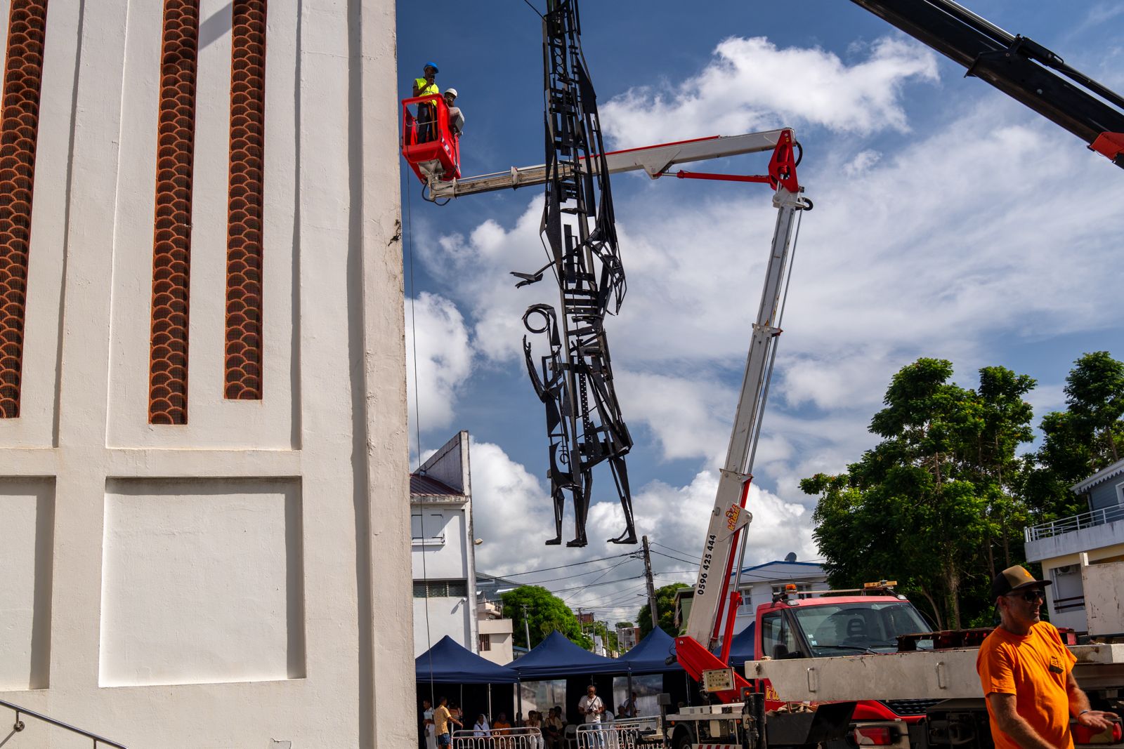 Sous les yeux de l'Archevêque de Martinique et nombreux paroissiens, la sculpture géante en fer forgé a été réinstallée au dessus de la porte d'entrée de l'église de Bellevue après sa restauration.