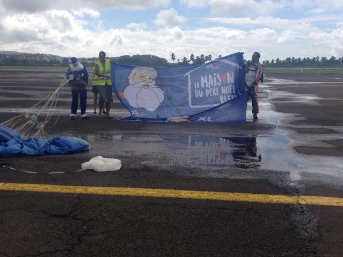 Il était attendu par une vingtaine d'enfants tout excités à l'idée de le rencontrer. Il c'est le père Noël qui a fait une arrivée spectaculaire en parachute, dans le ciel Lamentinois direction l'aéroport Aimé Césaire.
