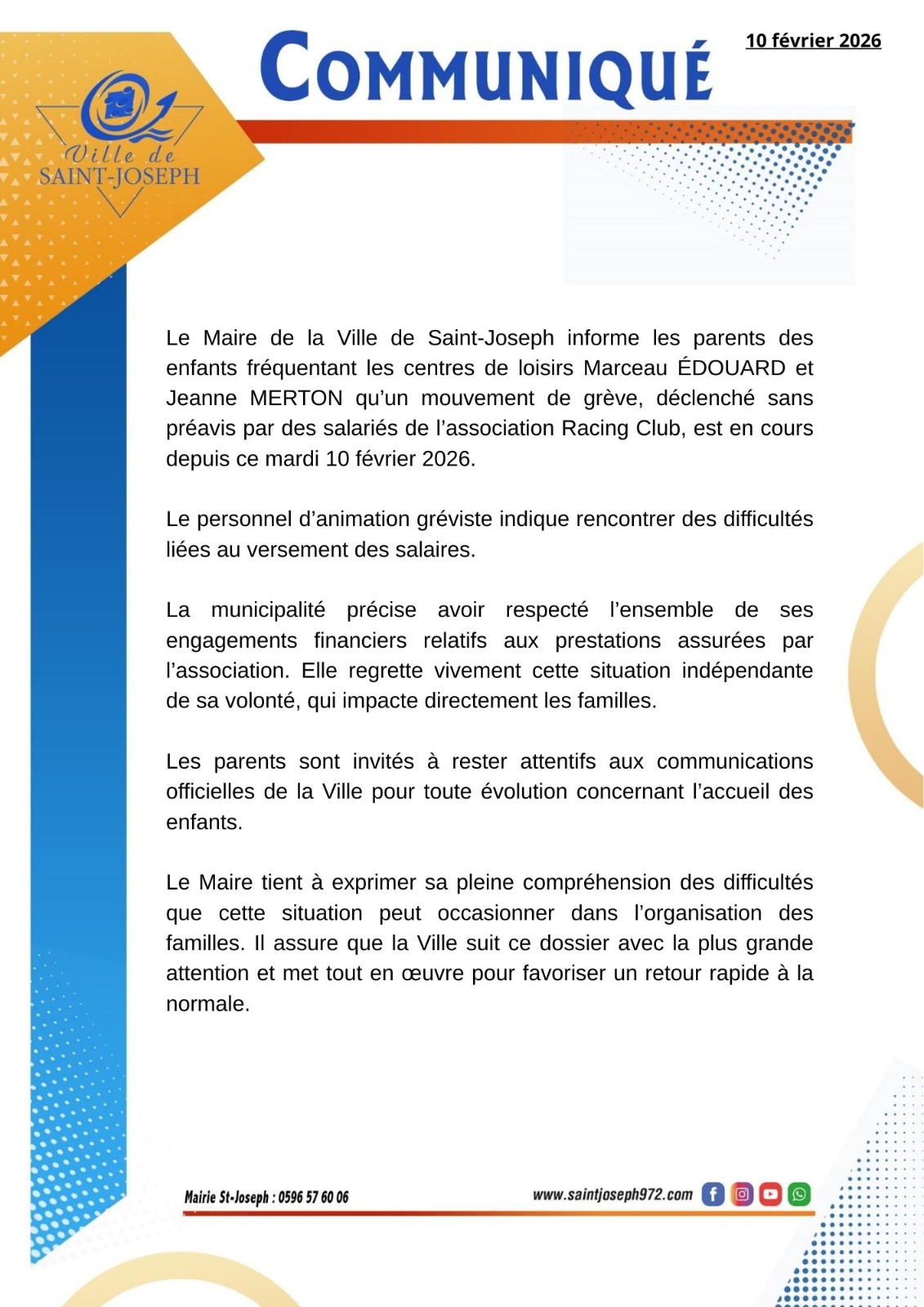 Le mouvement social entamé ce mardi 10 février par les animateurs territoriaux de Saint-Joseph a entraîné la fermeture exceptionnelle des structures Marceau Edouard et Jeanne Merton, empêchant ainsi l'accueil habituel des jeunes publics.