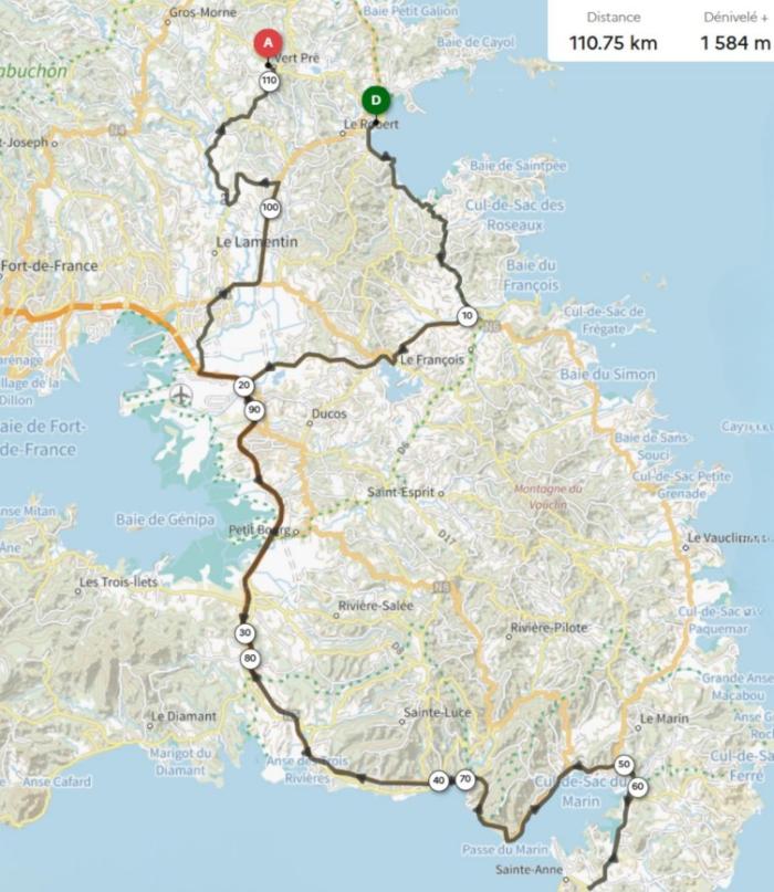 Départ Réel : 13h00 Courbaril face à MACK 2 Le Robert Giratoire Saint-Christophe Tourner à droite—Giratoire Mansarde Tourner à droite— Giratoire Gaschêtte Demi-tour— Giratoire Mansarde Tourner à gauche— Giratoire Saint-Christophe Tourner à droite— Giratoire Collège 3— Danone "Ilot central sur la route du Port"— FRANCOIS Sommet Chopotte— Stade du François— Giratoire Martienne tourner à droite— Giratoire 4 Croisées— DUCOS Giratoire Fond savane— LAMENTIN Giratoire Carrère "direction Rivièresalée"— DUCOS Giratoire Cocotte— RIVIERE SALÉE Giratoire Petit Bourg— Giratoire Rivière Salée "OUVERTURE RAVITAILLEMENT"— SAINTE LUCE Giratoire Céron—Giratoire Gros Raisins— RIVIERE PILOTE Giratoire Poirier— Giratoire Anse Figiuer— MARIN Giratoire Centre commerciale Annette— Croisé Fouquette touner à droite direction Sainte-Anne— Giratoire Cap Chevalier— MARIN Giratoire 4 Chemins— Croisée Fouquette touner à gauche direction Sainte-Luce— Giratoire centre commercial Annette— RIVIERE PILOTE Giratoire Poirier— SAINTE LUCE Giratoire Gros Raisins— Giratoire Rivière Salée— Giratoire Petit Bourg— DUCOS Giratoire Cocotte— LAMENTIN Sortie échangeur aéroport direction LE ROBERT— Giratoire Intertsport— Giratoire gendarmerie tourner à droite direction LE ROBERT— Giratoire Union 3ème sortie direction LE ROBERT— Giratoire Sarrault— Giratoire Pelletier 3ème sortie— Ecole de Pelletier— Giratoire Durocher 1ère sortie direction VERT-PRÉ—VERT-PRÉ Sommet école Marternelle continuer tout droit direction GROS MORNE— Collège Constant LE RAY tourne à gauche direction GROS MORNE