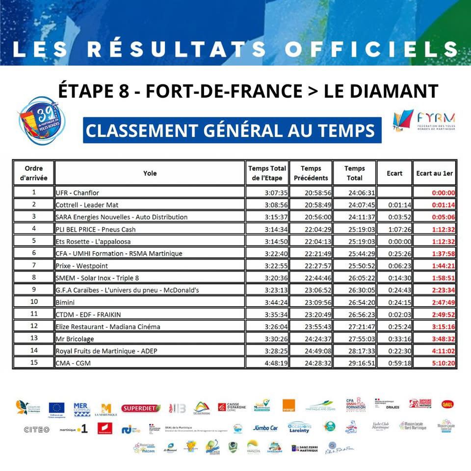 Lors de l'ultime étape du tour des yoles 2025 entre Fort-de-France et le Diamant, UFR/Chanflor s'est imposé devant Cottrell/Leader Mat et SARA/Auto-Distribution, après 3h 07min de navigation. Après un grand moment d'incertitude, la fédération a officiellement reconnu UFR/Chanflor comme le vainqueur du tour de Martinique 2025.